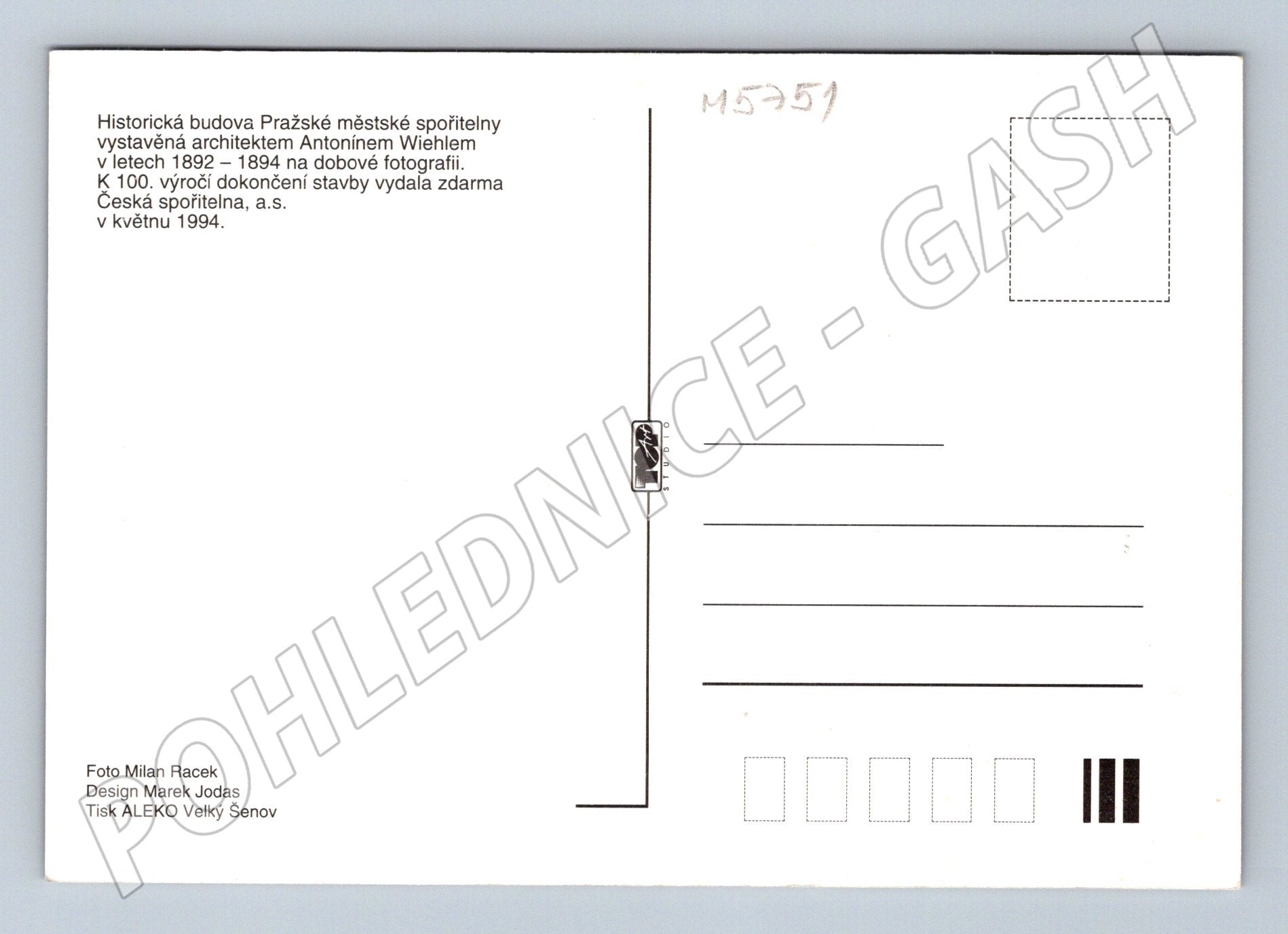 Postcard issued on the occasion of the 100th anniversary of the completion of the historic building of the Prague City Savings Bank, built by architect Antonín Wiehl in 1892–1894. The front side features a period photograph of significant Prague architecture with a detailed view of the interior. The back side contains information about the postcard being issued by Česká spořitelna as in May 1994 and details about the photograph and design (photo Milan Racek, design Marek Jodas, printing Aleko Velký Šenov). The postcard is in very good condition, unmarked and unused. Ideal for collectors of architecture or Prague motifs.