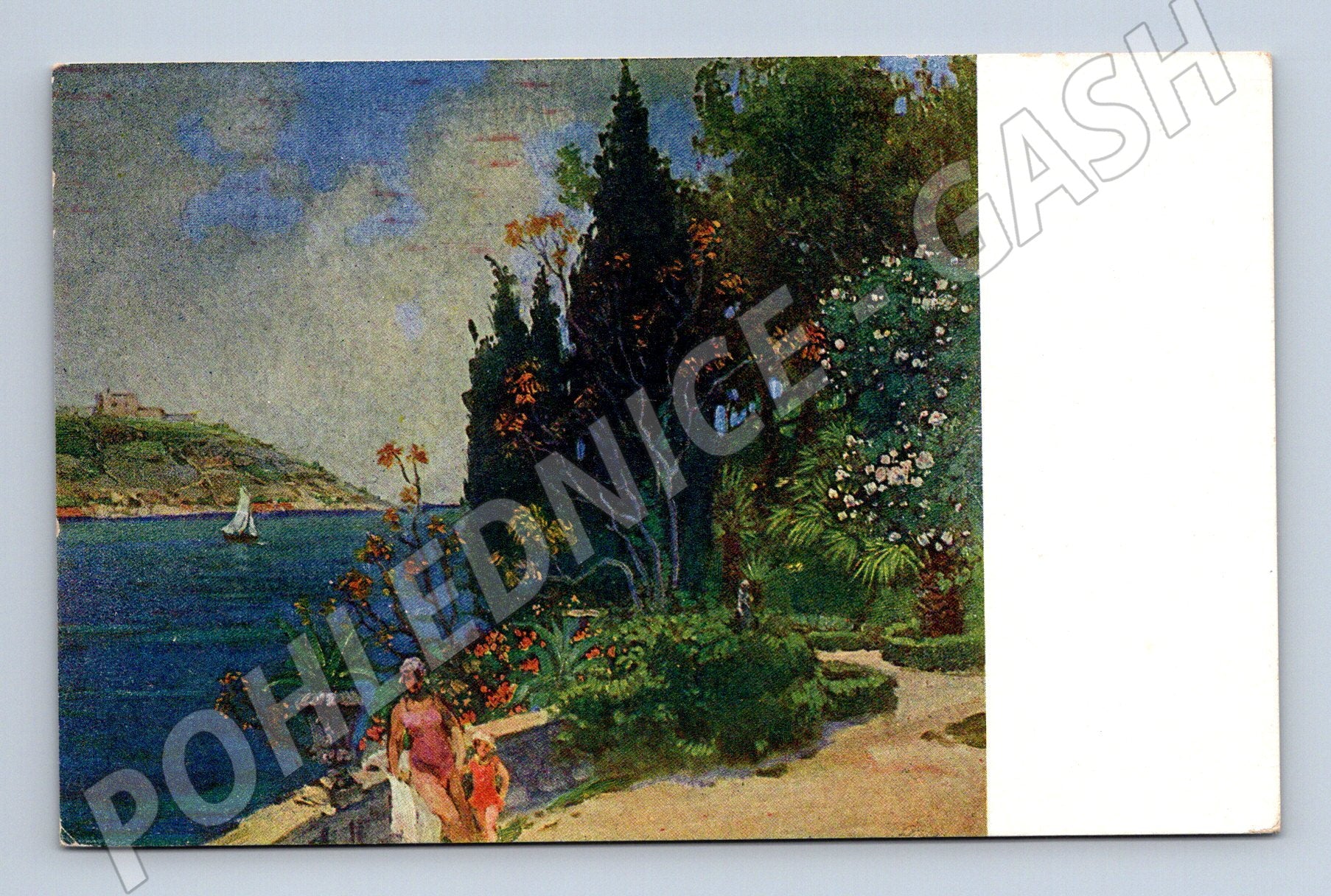 Originální pohlednice z období Protektorátu Čechy a Morava, odeslaná v roce 1945 z Prahy. Na lícové straně je barevná reprodukce malířské scenérie – letní odpočinek u moře na ostrově Vis. Na zadní straně najdete válečné známky Německé říše s portrétem Adolfa Hitlera, jasně čitelný poštovní razítko z Prahy, ručně psaný vzkaz i adresu. Pohlednici vydala Unie Praha, je v dobrém sběratelském stavu a představuje unikátní dobový doklad jak z hlediska filatelie, tak sběratelství historických pohlednic z ČR.