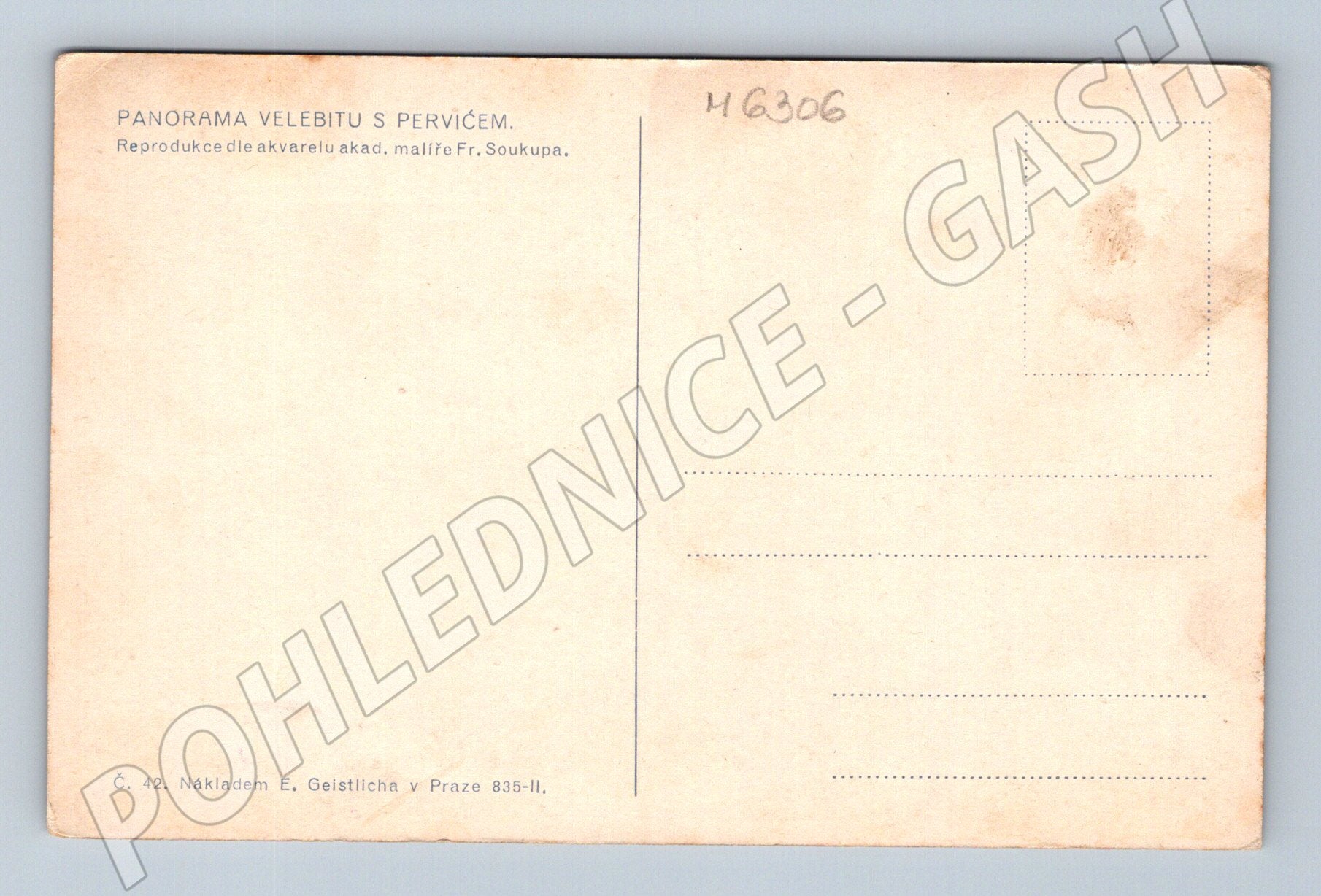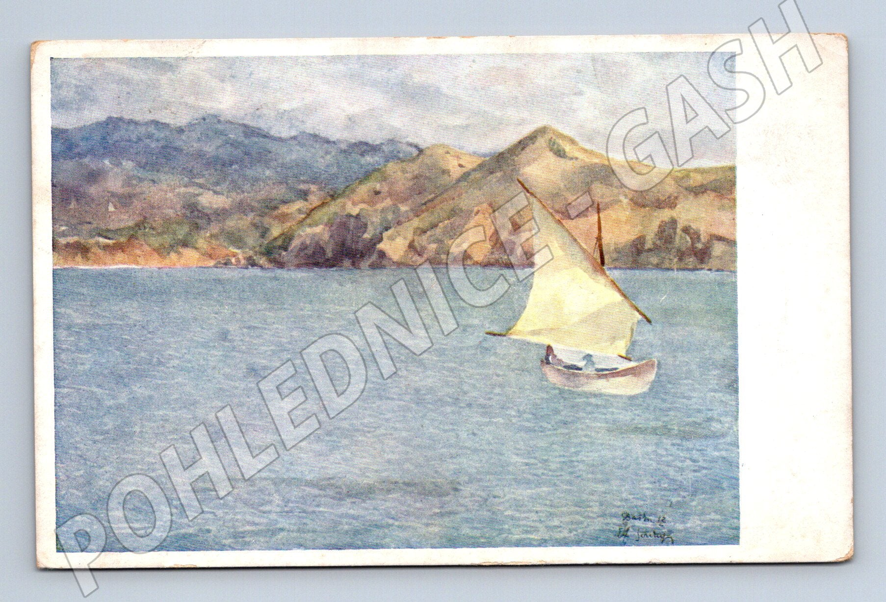Originální pohlednice s názvem Panorama Velebitu s Pervičem , která je reprodukcí akvarelu akademického malíře Františka Soukupa. Pohlednice zachycuje krásnou scenérii hor Velebit nad mořem, kde je v popředí vyobrazen člun s plachtou na vodní hladině. Jedná se o vydání nakladatelství E. Geistlicha v Praze (č. 42 835-II). Na zadní straně je standardní dělení pro poštovní použití a malý popis v češtině. Pohlednice je ve vintage stavu, má drobné známky stáří, patinu a drobná opotřebení na hranách, jak je patrné z fotografie. Ideální sběratelský kousek pro milovníky starých pohlednic, umění a námořní tematiky.