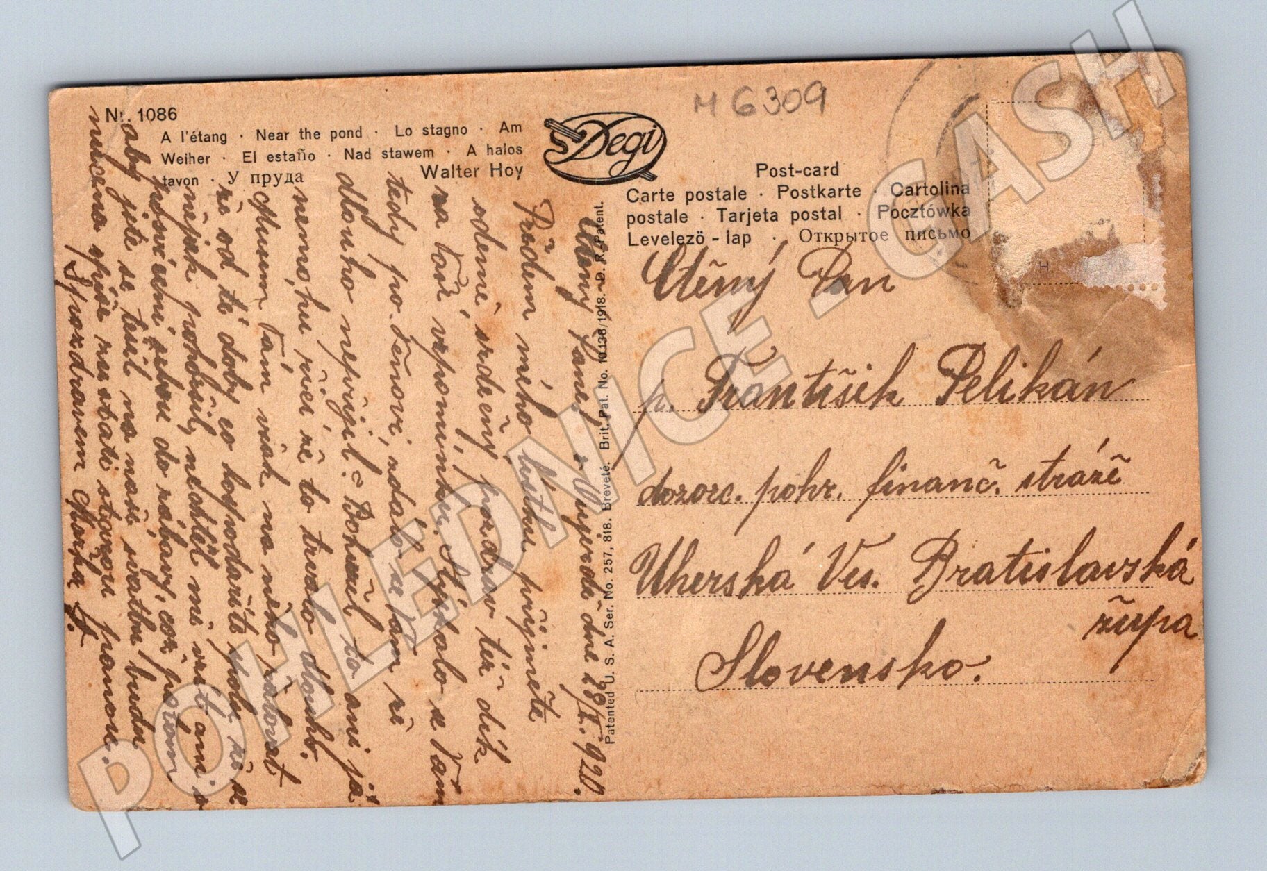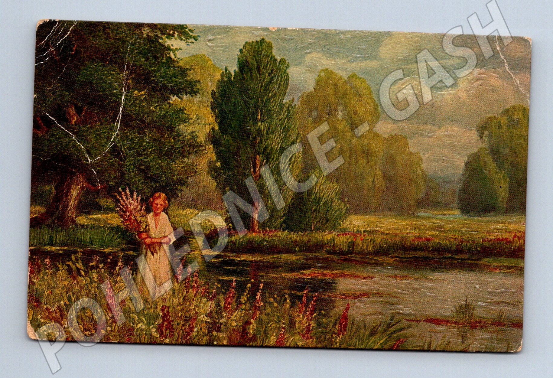 Originální stará pohlednice s názvem Nad stawem / Near the pond / A l étang , kterou vytvořil známý malíř Walter Hoy. Na lícové straně je romanticky laděný malířský motiv dívky s květinami u rybníka, obklopené přírodou a stromy. Na zadní straně je částečně čitelný rukopisný text s adresou na Slovensko, razítko a stopy poštovního provozu. Pohlednice vykazuje známky stáří – menší ohyby a oděrky na rozích a hranách, lehké praskliny na přední straně a zbytky po poštovní známce. Vhodné pro sběratele pohlednic s malířskými náměty, případně jako dekorace nebo pro milovníky starých slovensko-českých korespondencí. Stav odpovídá stáří, viz foto.