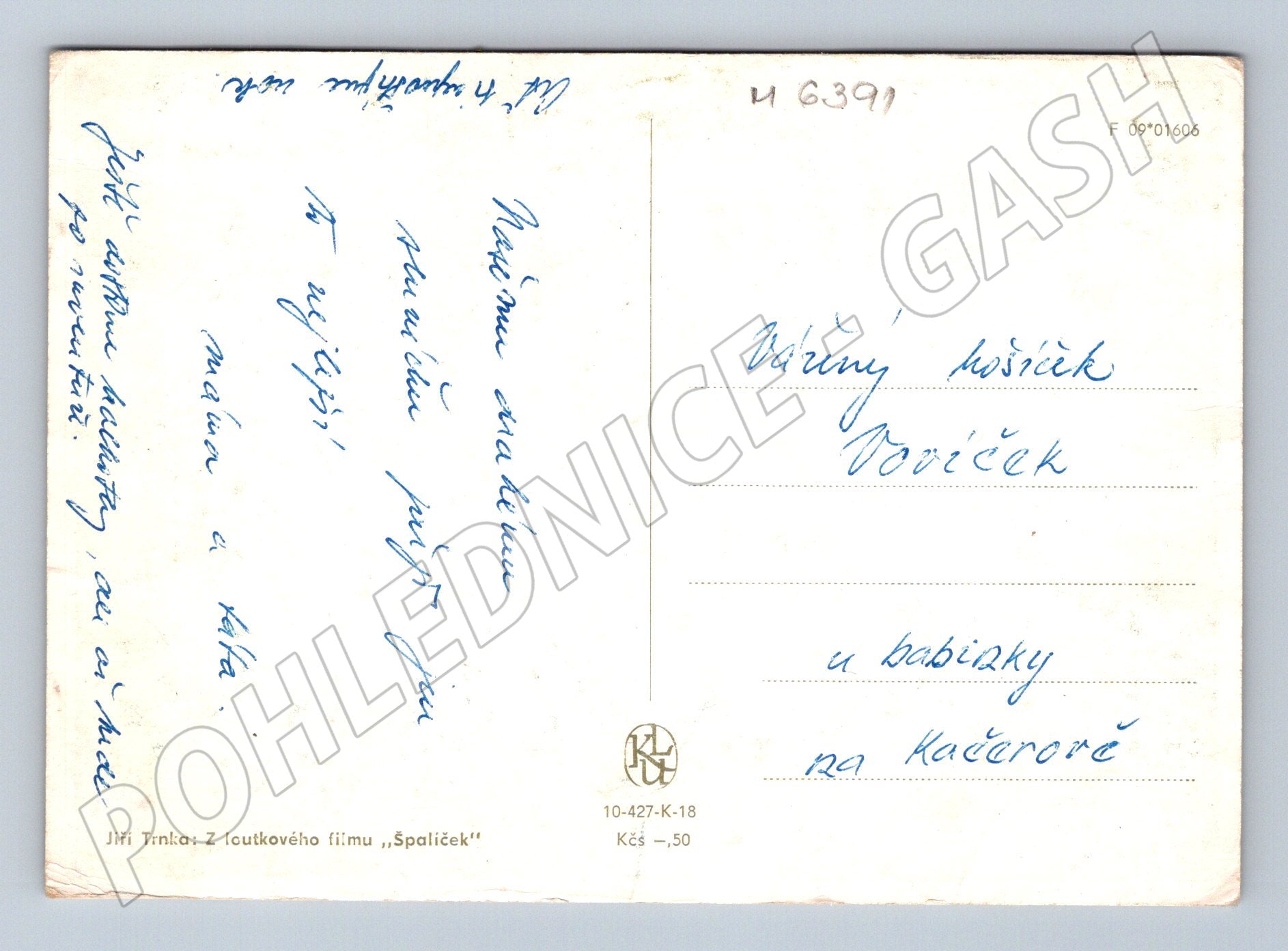 Originální pohlednice s motivem scény z loutkového filmu Jiřího Trnky Špalíček . Na pohlednici je vyobrazena roztomilá postavička ležící pod deštníkem na louce a vedle ní běhá bílý pejsek, pravděpodobně špic. Pohlednice je zachovalá, má ručně psaný text na zadní straně, určeno pro sběratele, milovníky filmu nebo fanoušky Jiřího Trnky. Vydáno původně v Československu. Formát klasické pohlednice, vzadu je adresní strana a místo pro známku. Skvělý sběratelský kousek z české loutkářské historie, vhodné také jako dárek.