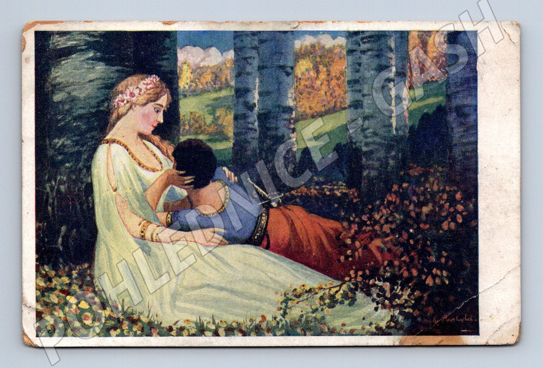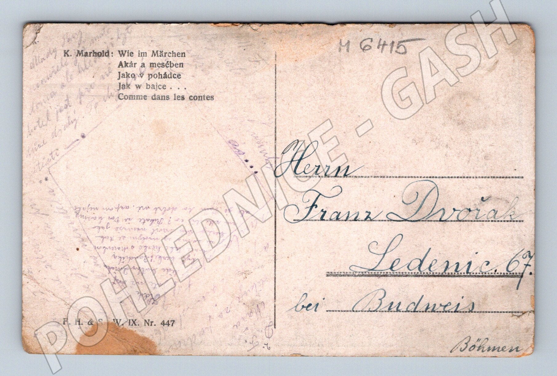 Starší pohlednice s malířským motivem dvou žen v přírodě od autora K. Marholda, s názvem Wie im Märchen (Jako v pohádce). Pohlednice pochází pravděpodobně z počátku 20. století, tisk F. H. & S. W., IX. Nr. 447. Na přední straně je barevná malba s romantickou scénou v lese, vzadu je text v několika jazycích i staré poštovní adresování a ručně psaný vzkaz. Pohlednice nese typické známky stáří: otřepené okraje, drobné zašpinění a byla již použita. Jedná se o krásnou ukázku historické pohlednice vhodné pro sběratele nebo milovníky umění a starých tisků.
