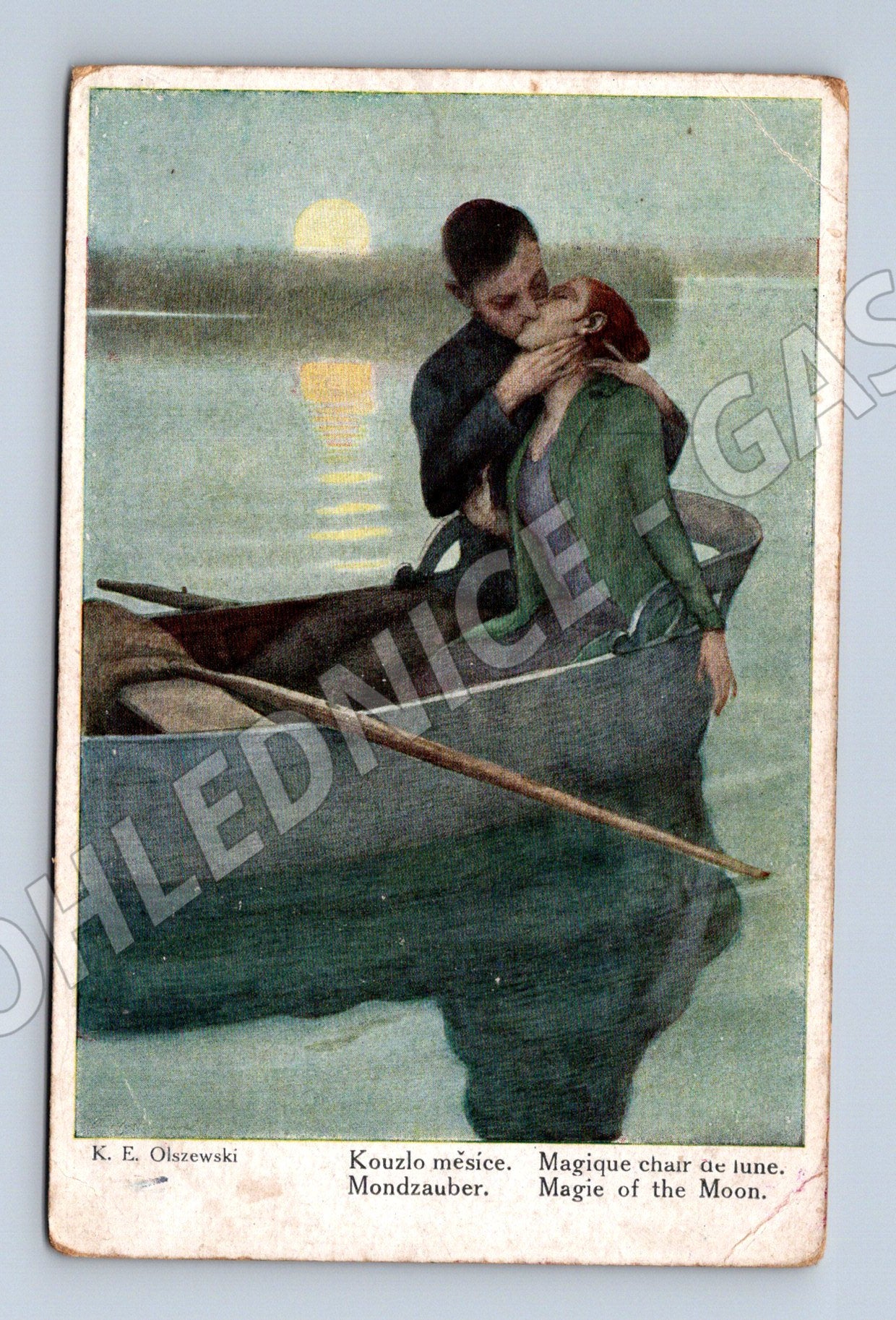 Nabízím starou uměleckou pohlednici s názvem Kouzlo měsíce / Magique char de Lune / Magic of the Moon / Mondzauber od autora K. E. Olszewski. Pohlednice zobrazuje romantickou scénu dvou lidí v lodi za měsíčního svitu. Na rubu je vytištěná značka Prague a číslo 2003. Pohlednice nese známky stáří, lehké opotřebení okrajů a drobné skvrny, vhodné pro sběratele či milovníky umění. Velmi dekorativní motiv.
