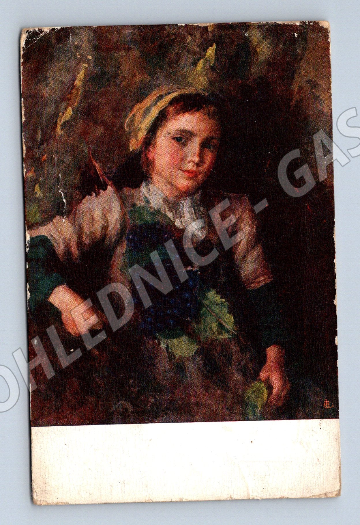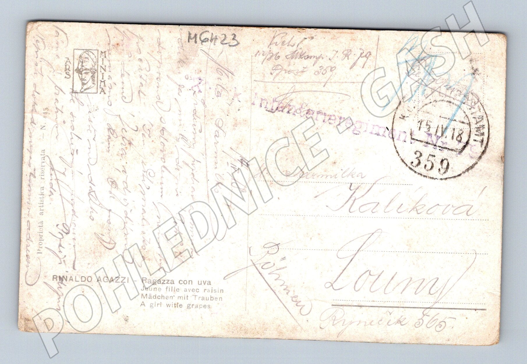 Originální stará pohlednice s uměleckým motivem od malíře Rinalda Agazziho, nazvaná Ragazza con uva (Dívka s hrozny). Na pohlednici je zobrazen portrét mladé dívky s hrozny v rukou, malovaný realistickou technikou s jemnými odstíny. Na zadní straně najdete popis ve čtyřech jazycích – italsky, francouzsky, německy a anglicky – a také ručně psaný vzkaz s razítkem z roku 1918. Pohlednice nese známky stáří, drobné opotřebení na rozích, vhodná pro sběratele historických pohlednic a zájemce o malířství. Rozměry odpovídají tehdejším standardům, vhodné do sbírky. Unikátní sběratelský kousek. k.u.k. Infanteriregiment feldpost polní pošta