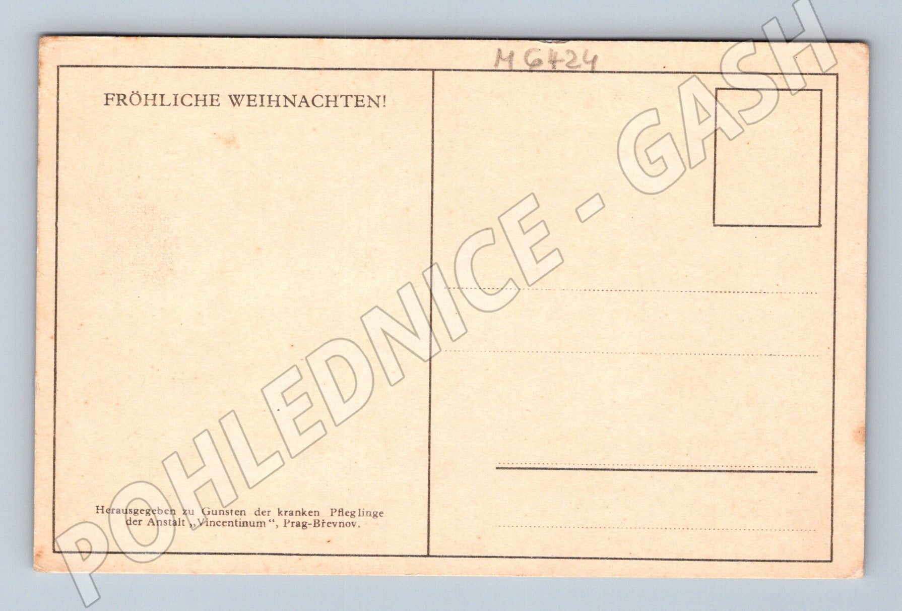 Starobylá vánoční pohlednice s černobílým vyobrazením pastýřů a oveček u jesliček, sledujících na noční obloze jasnou kometu. Text na zadní straně pohlednice: FRÖHLICHE WEIHNACHTEN! . Pohlednice byla vydána ve prospěch nemocných pacientů ústavu Vincentinum , Praha-Břevnov. Jedná se o malý formát, odhadováno z první poloviny 20. století. Pohlednice není popsána ani odeslaná, stav odpovídá stáří – drobné zašpinění a patina. Krásná historická vánoční kolekce i pro sběratele.