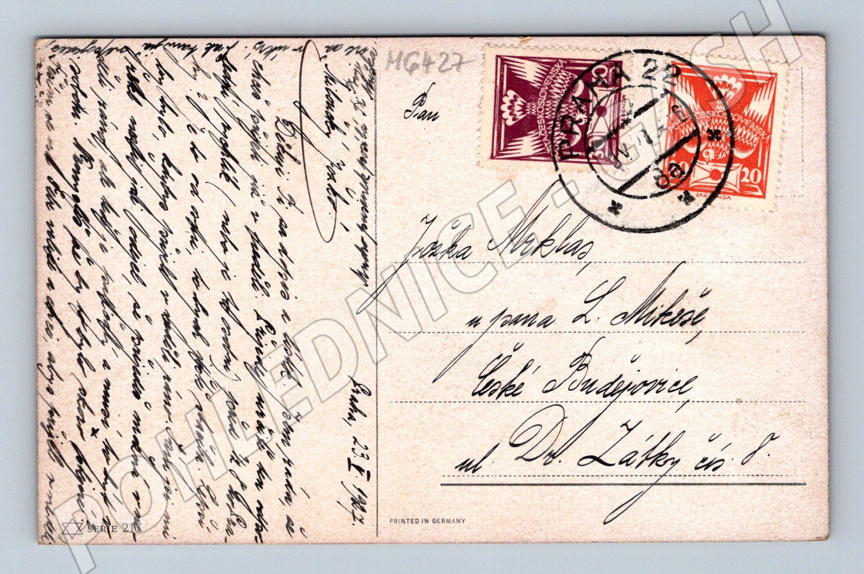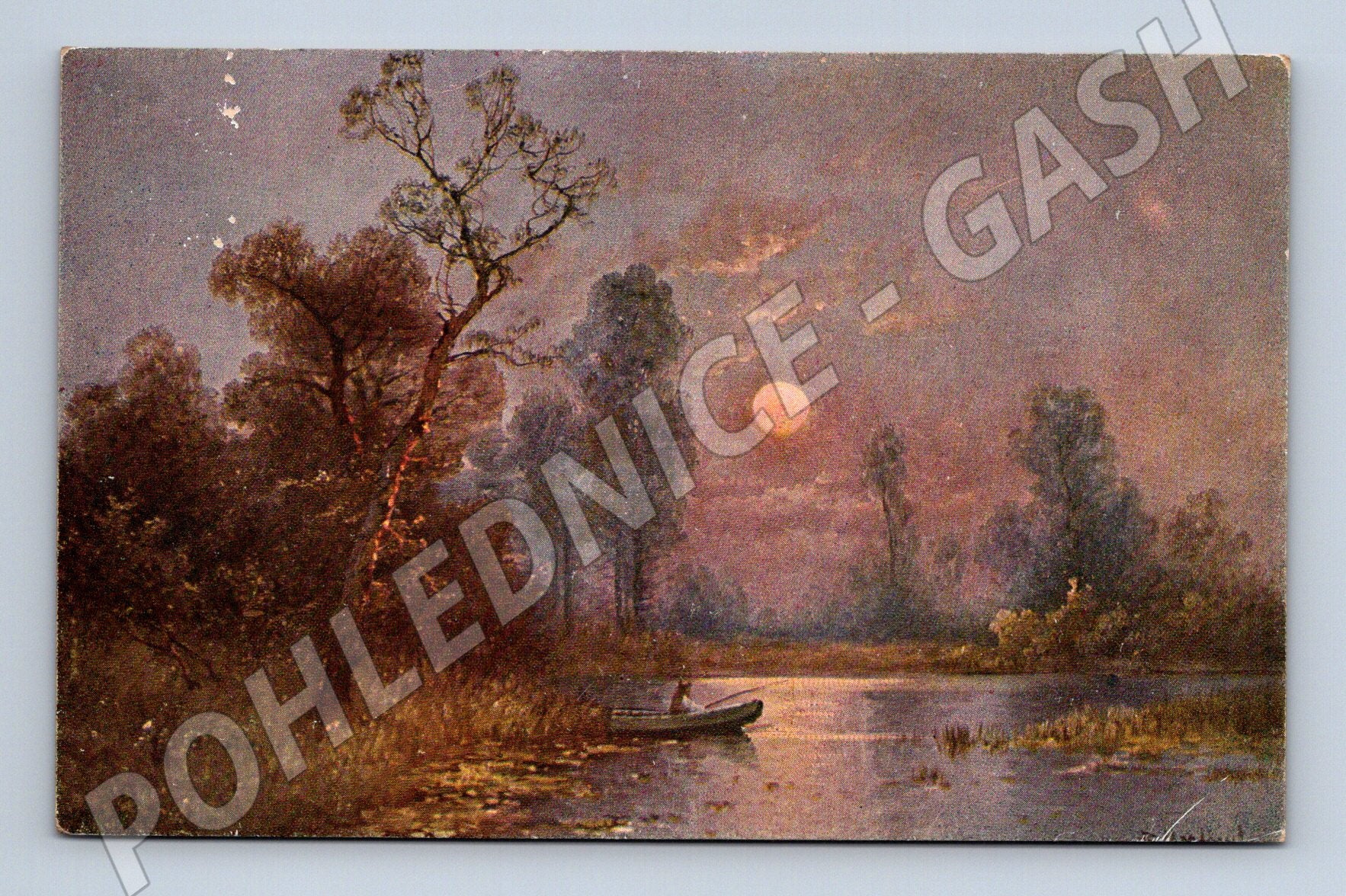 Starobylá pohlednice s malovaným motivem romantické noční krajiny u jezera s lodkou na hladině, v pozadí stromy ozařované úplňkem. Pohlednice je prošlá poštou, na zadní straně ručně psaný text a známky z období první republiky. Celkově velmi pěkný stav s menšími známkami stáří a patiny, mírné oděrky v rozích. Sbírkový kousek vhodný pro milovníky historických pohlednic a krásné krajinomalby.