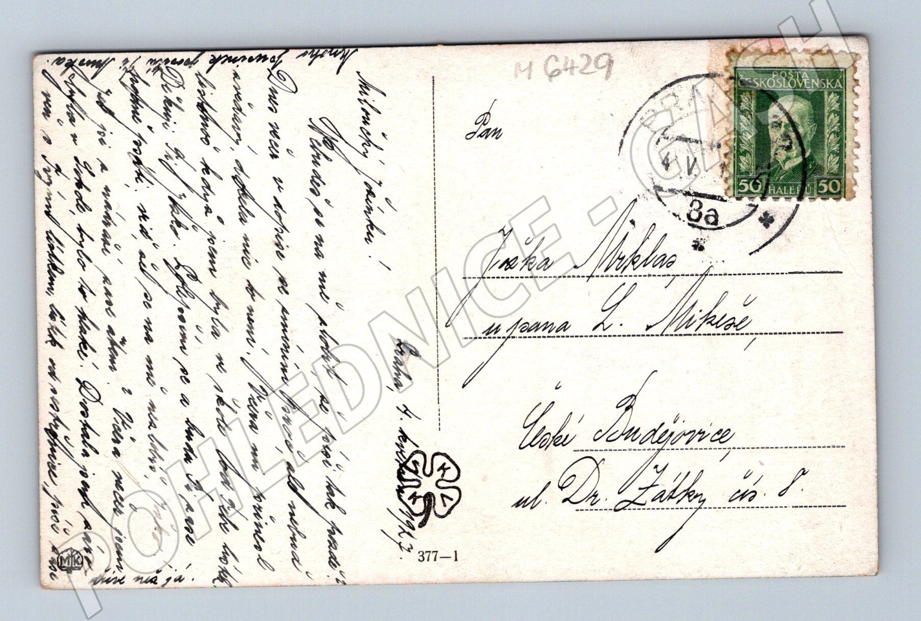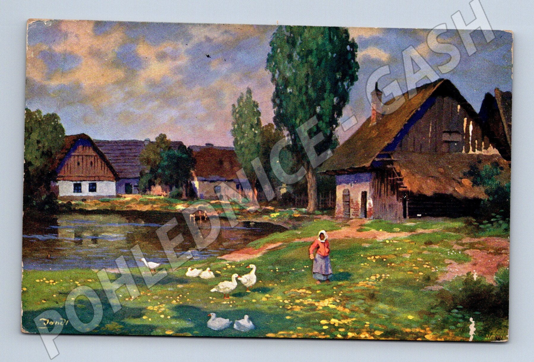 Nabízím originální starou pohlednici z období první poloviny 20. století s motivem venkovské české krajiny. Na přední straně pohlednice naleznete krásný malovaný motiv chalupy, rybníčku se skupinou hus a ženy v kroji. Pohlednice byla odeslána poštou a je opatřena známkou a razítkem z Prahy. Na zadní straně se zachoval ručně psaný text a adresa příjemce v Českých Budějovicích. Pohlednice nese známky stáří, ale je ve velmi pěkném sběratelském stavu bez vážnějšího poškození. Skvělý přírůstek pro sběratele pohlednic s motivy českých vesnic a venkova.