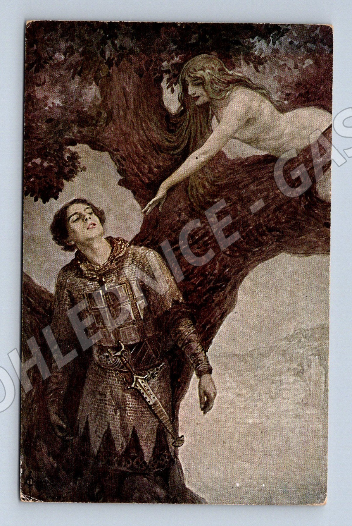 Starší pohlednice s uměleckým motivem od S. Solomka s názvem Die Versuchung / La tentation / Temptation (Pokušení). Pohlednice zobrazuje rytíře v brnění pod stromem a nad ním éterickou ženskou postavu, připomínající mýtickou nebo pohádkovou scénu. Reprodukce kvalitní kresby s jemnými detaily a originálním kolorováním. Pohlednice je nepopsaná, byla vydána společností T.S.N., číslo série R.M. 154. Výborný sběratelský stav s drobnými známkami stáří na hranách. Výjimečný kousek pro sběratele uměleckých či secesních pohlednic.