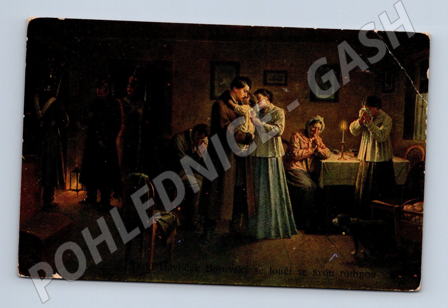 Originální stará pohlednice s uměleckým motivem – obraz Karel Havlíček Borovskýse loučí se svou rodinou od F. J. Jedlička, vydaná v Praze. Pohlednice byla odeslána z Prahy v roce 1942 (dle razítka a známky). Na přední straně je vyobrazen dojemný okamžik loučení v rodinném kruhu, obrázek je doplněn dobovým ručně psaným textem na zadní straně. Pohlednice nese známky stáří, rohy jsou lehce ohnuté, je patrný ohyb v pravém horním rohu a drobné obroušení. Vhodné pro sběratele historických pohlednic, zájemce o umění či období první poloviny 20. století. Velmi zajímavý sběratelský kus.