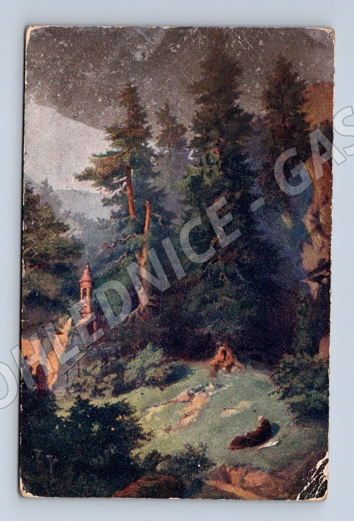 Starší pohlednice s motivem krajiny a hradu. Pohlednice nese stopy stáří, včetně výrazného opotřebení, oděrek a zašpinění. Zadní strana je místy velmi zašpiněná, místy zůstaly skvrny, a v horní části je ručně napsané číslo. Jedná se o zajímavý sběratelský kus vhodný pro milovníky historických pohlednic a motivů hradů či zámků. Pohlednice pravděpodobně pochází z první poloviny 20. století. Formát odpovídá klasickým rozměrům dobových pohlednic. Vhodné do sbírky nebo jako dekorace.