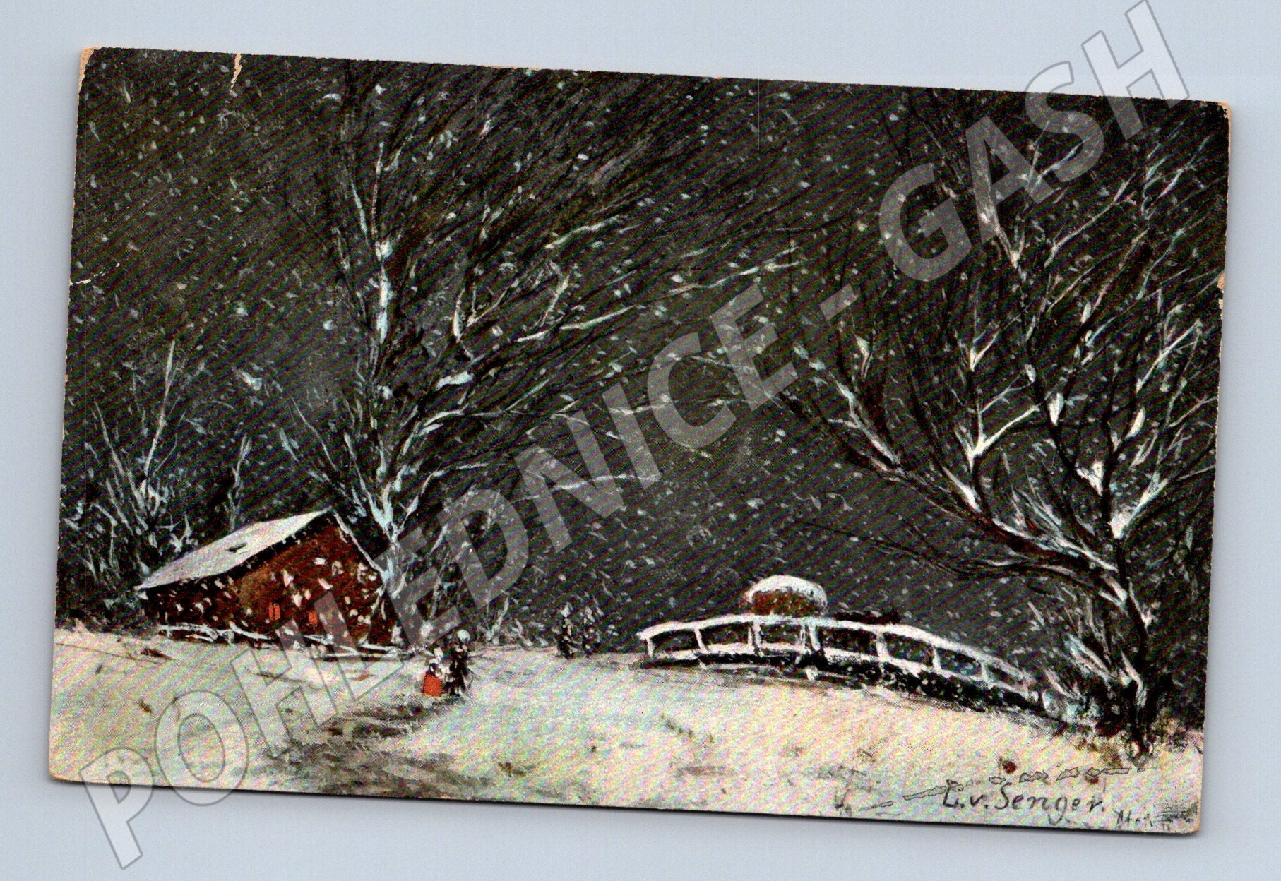 Nabízím starou pohlednici s krásným zimním motivem – malebná zasněžená krajina s dřevěným mostkem a chaloupkou pod zasněženými stromy, doplněná postavou v červeném oděvu. Umělecké zpracování s výraznou atmosférou zimní noci, signováno (Ev. Senger). Pohlednice má klasický rozměr malého formátu, rubová strana je nepopsaná, bez známky, pouze s drobným starým zápisem tužkou a perem. Vhodné pro sběratele historických pohlednic či milovníky zimních a nostalgických námětů. Stav odpovídá stáří, viz foto.