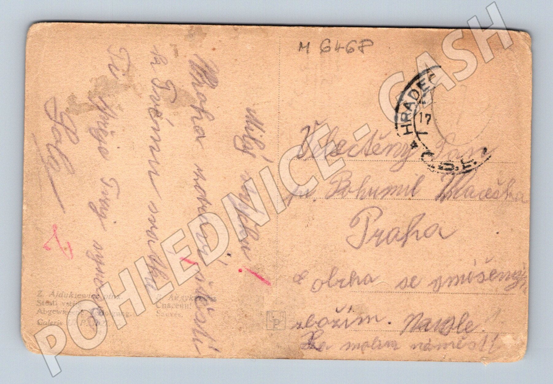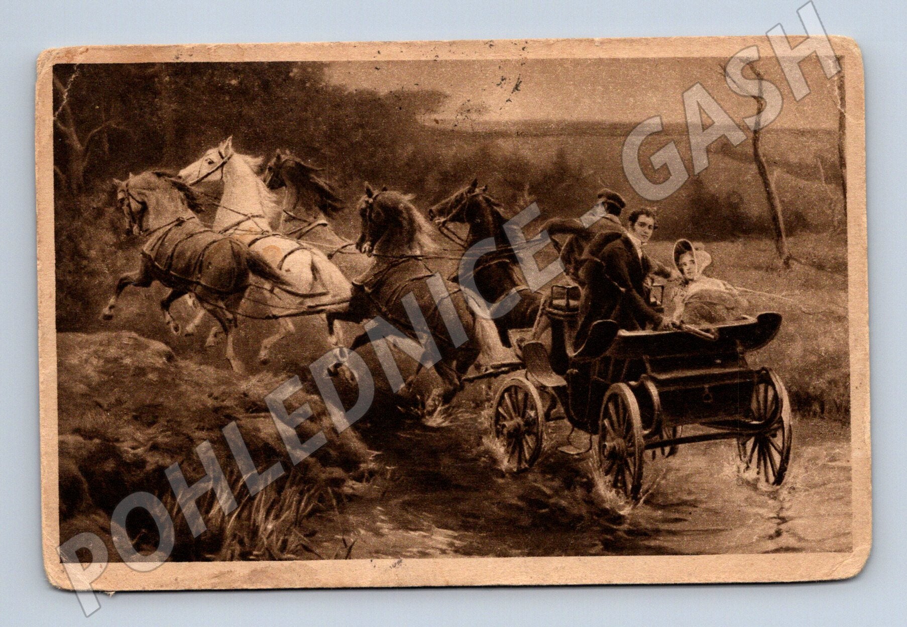 Originální stará pohlednice s motivem koňského povozu, ve kterém cestuje dvojice osob. Pohlednice zobrazuje detailní scénu jízdy venkovskou krajinou, kde čtyřspřeží táhne elegantní kočár s kočím a pasažéry. Pohlednice je prošlá poštou (razítko Hradec), s ručně psaným textem a adresou na zadní straně. Stav odpovídá stáří – mírně opotřebované rohy, drobné známky používání. Vhodné pro sběratele historických pohlednic i zájemce o dobovou dopravu a koně.