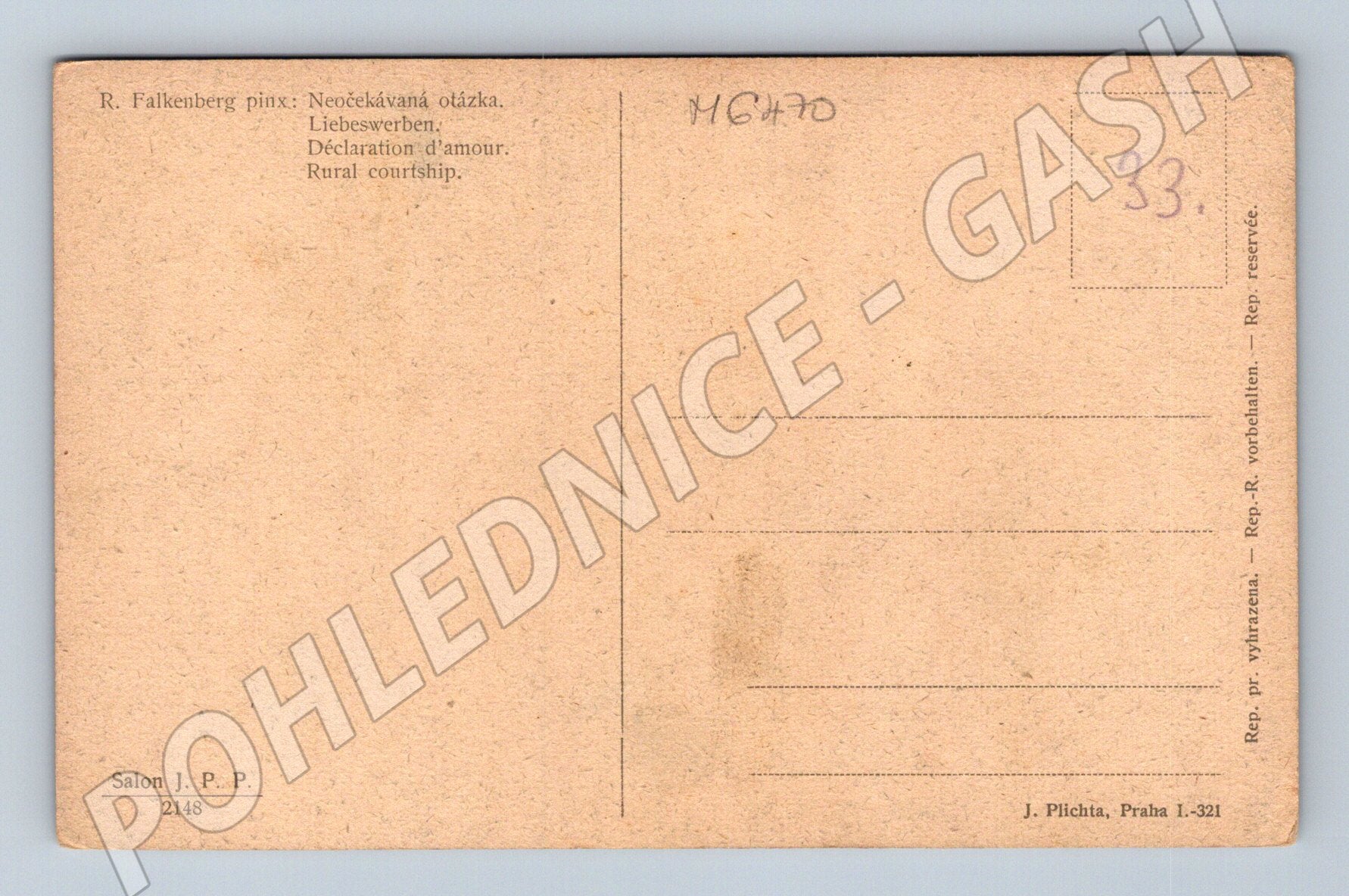 Starší pohlednice s názvem Neočekávaná otázka (R. Falkenberg, Salon J. P. P. 2148), vydaná J. Plichta, Praha. Pohlednice zachycuje venkovskou scénu dvoření – mladý muž a žena v lidovém kroji na poli při západu slunce, v popředí zelenina (pravděpodobně zelí). Motiv vyjadřuje venkovský život a tradiční lidové zvyky. Na zadní straně je pohlednice nepopsaná, bez poškození, v dobrém sběratelském stavu. Tituly v několika jazycích: český, německý, francouzský, anglický. Vhodné do sbírek etnografických a tematických pohlednic.