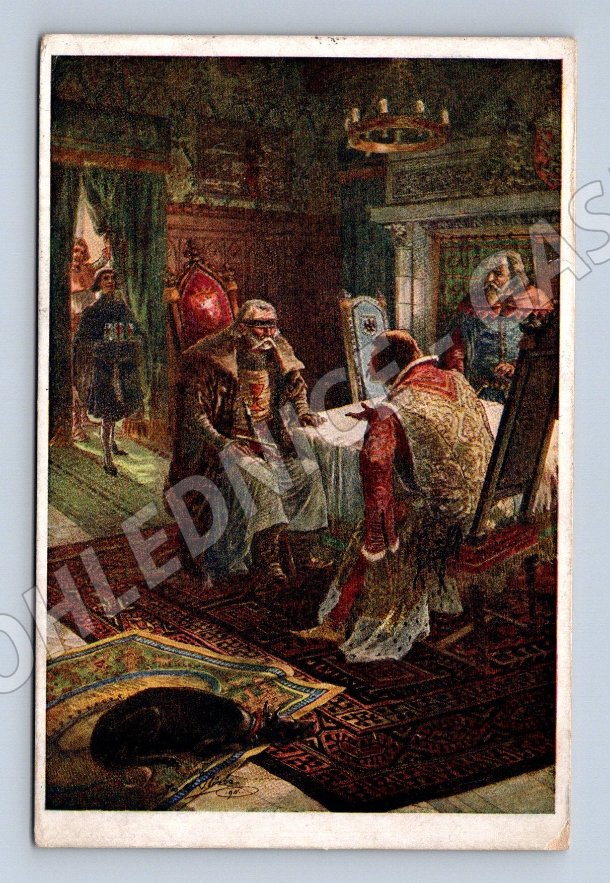 Nabízím starou pohlednici s historickým malovaným motivem, zachycujícím scénu středověkého jednání nebo audience ve slavnostně vyzdobeném interiéru. Obraz je bohatě detailně proveden, dominuje mu postava muže pokorně klečícího před postavou se zlatou korunou na červené stoličce, kolem se nacházejí další osoby v dobových šatech. Pohlednice byla odeslána a je na ní dobové rukopisné psaní a razítko. Perfektní pro sběratele témat historických scén nebo malířských pohlednic. Stav viz foto. Rozměry klasického malého formátu. Ojedinělý kus vhodný do sbírky. Jan žižka ČS. POJÍZDNÉ DĚLOSTŘELECKÉ DÍLNY