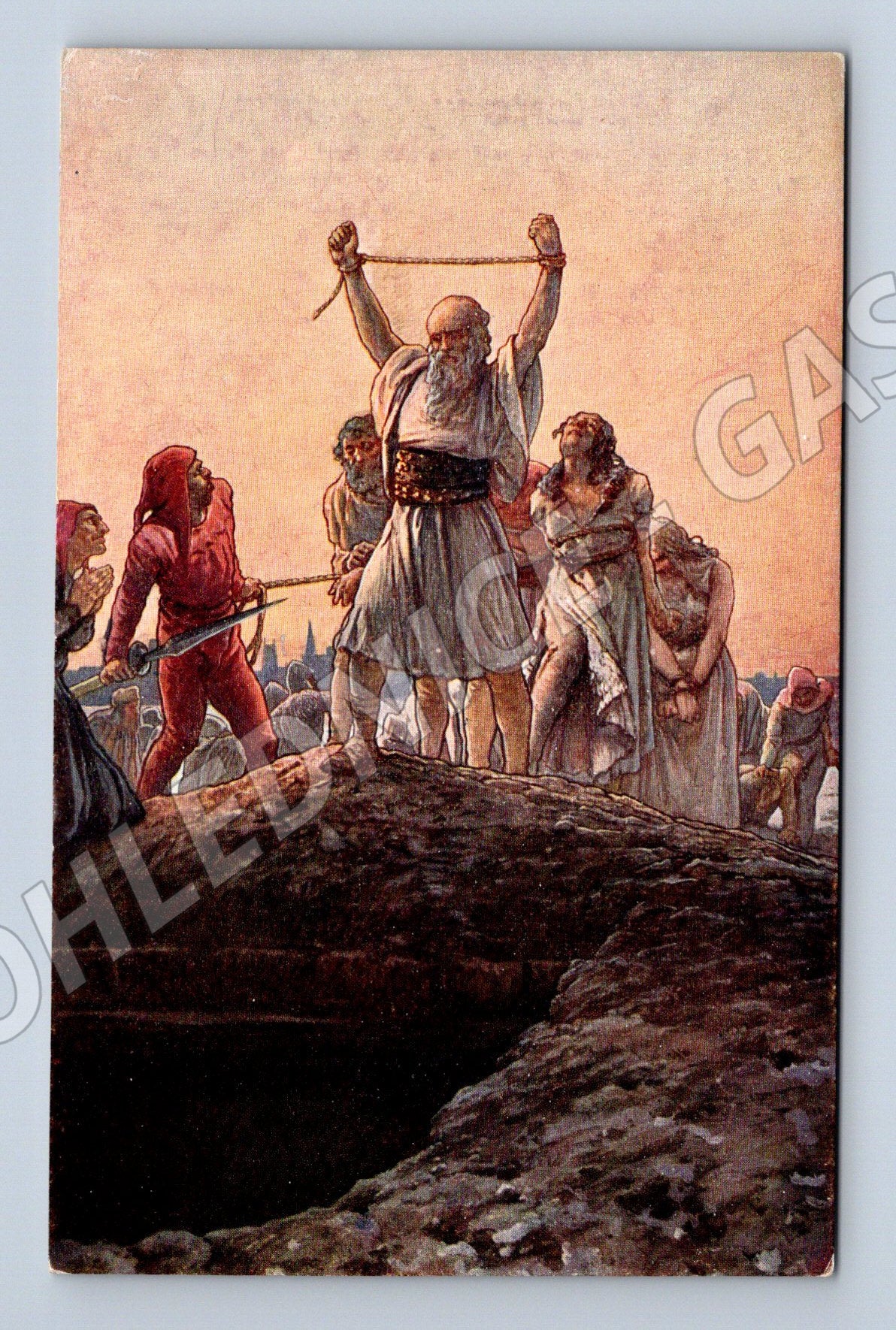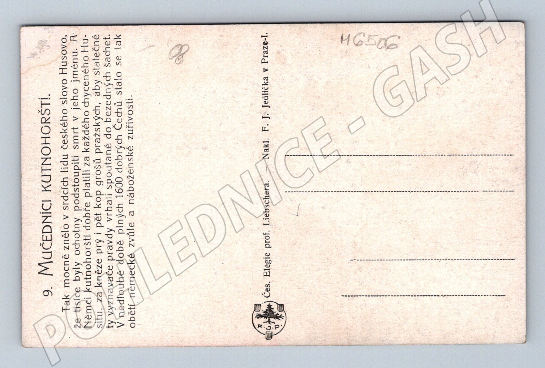 Historická pohlednice s názvem Mučedníci kutnohorští z edice Český Erb (prof. Liebscher). Pohlednice zachycuje dramatickou scénu z českých dějin, spojenou s husitským obdobím a pronásledováním stoupenců Jana Husa v Kutné Hoře. Umělecké zpracování ukazuje dramatický moment, kdy jsou čeští věřící vrháni do šachty pro svou víru. Na zadní straně pohlednice je dobový popis události. Pohlednice nese známky stáří, bez popisu a známky, velmi zachovalý stav. Ideální pro sběratele historických a tematických pohlednic, zájemce o českou historii či malířství.