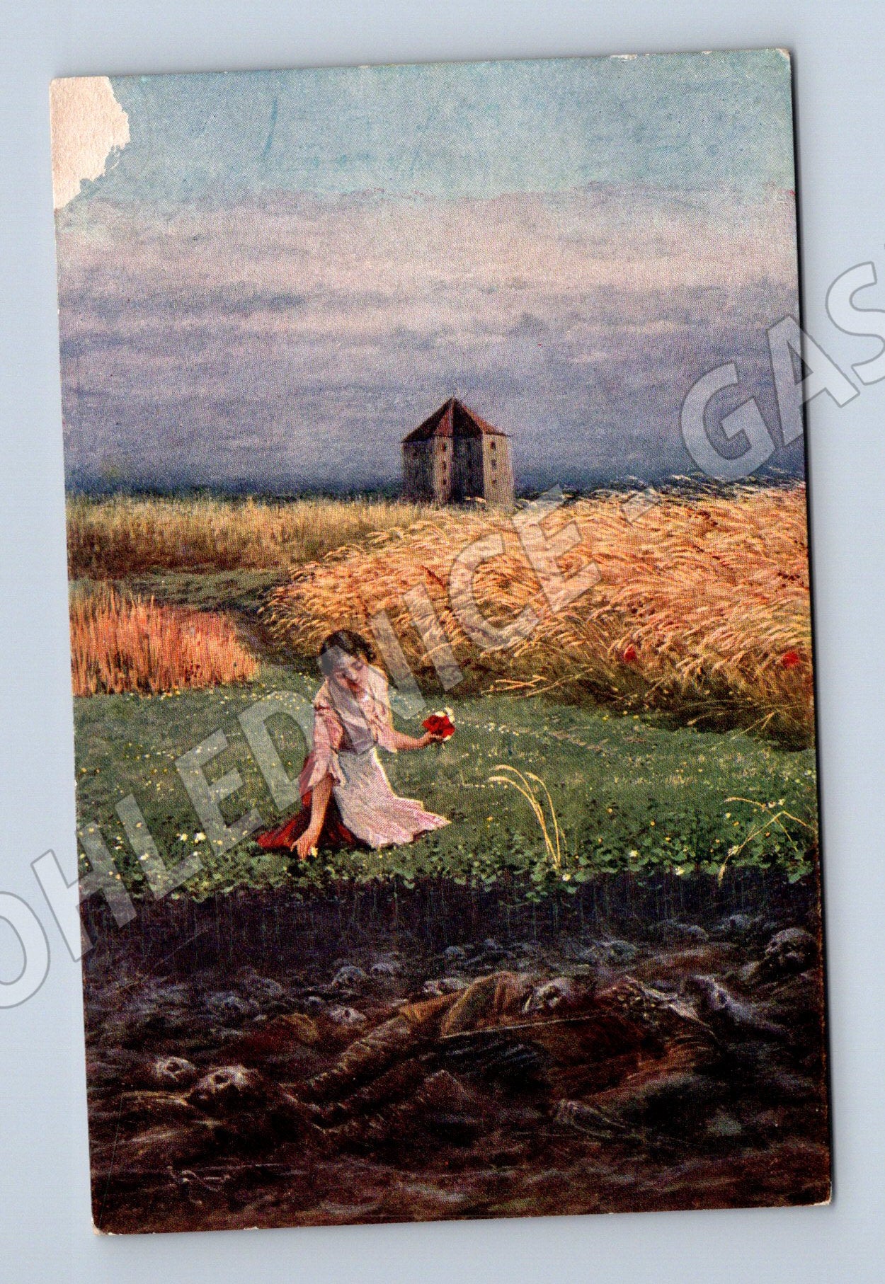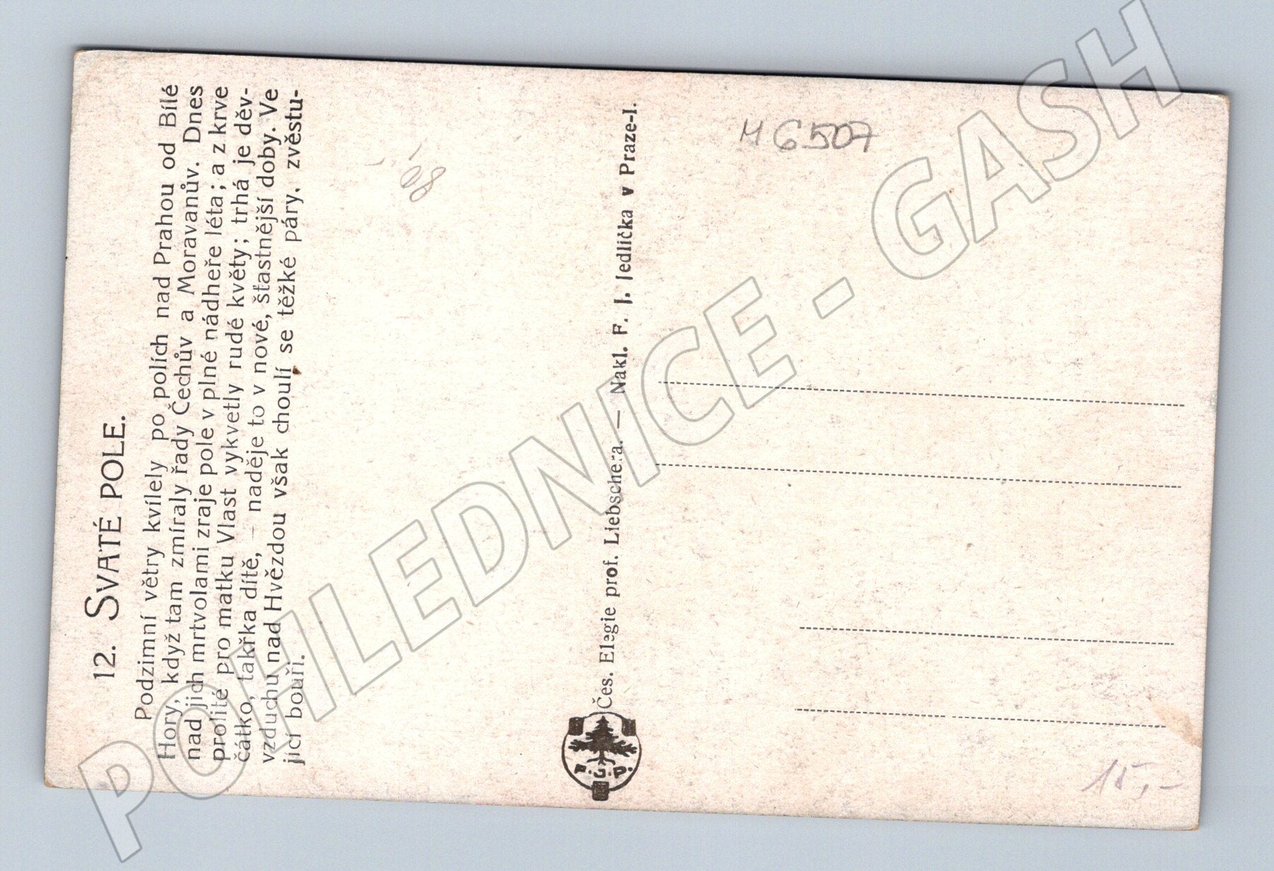 Pohlednice s názvem Svaté pole je reprodukcí malířského díla zachycujícího malebnou scenérii české krajiny. Na přední straně vidíme dívku sbírající květy na poli s kostelem v pozadí, motiv evokuje klidné, poetické chvíle venkova. Zadní strana pohlednice obsahuje poetický text vztahující se k místu Svaté pole a atmosféře podzimu. Pohlednice je vydaná českým nakladatelstvím, má zachovalé barvy, pouze v pravém horním rohu je lehké opotřebení. Jedná se o sběratelský kousek vhodný pro milovníky historických a malířských pohlednic.