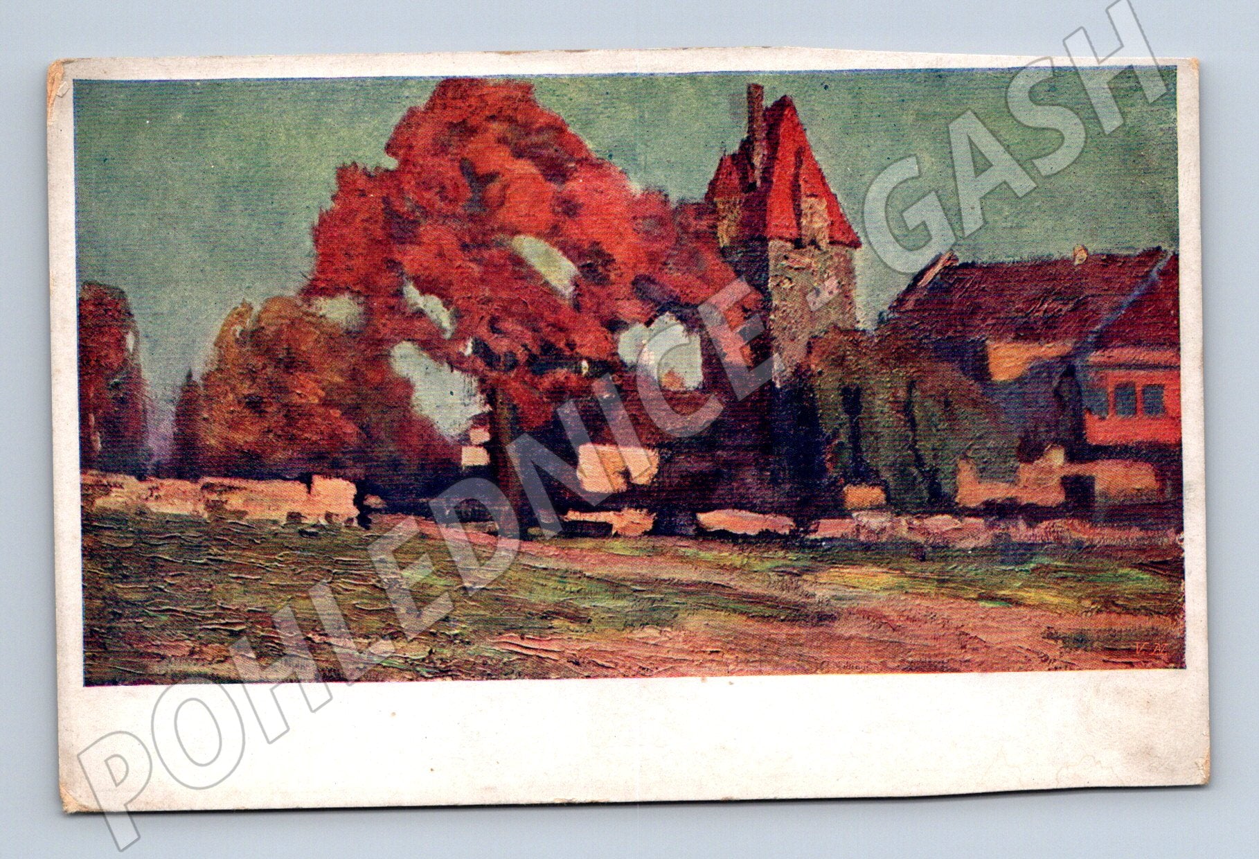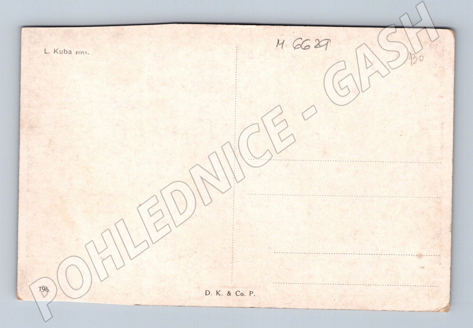 Pohlednice s motivem malovaného podzimního krajinného výjevu od známého českého malíře Ludvíka Kuby (značeno L. Kuba pinx. ). Pohlednice zachycuje starý venkovský dům či kostel uprostřed pestrých podzimních stromů, v typicky impresionistickém stylu autora. Zadní strana je neprošlá, čistá, pouze s lehkým zašpiněním odpovídajícím stáří a s číslem 796 a vydavatelem D. K. & Co. P. Skvělý doplněk do sbírky milovníků českého malířství nebo historických pohlednic.