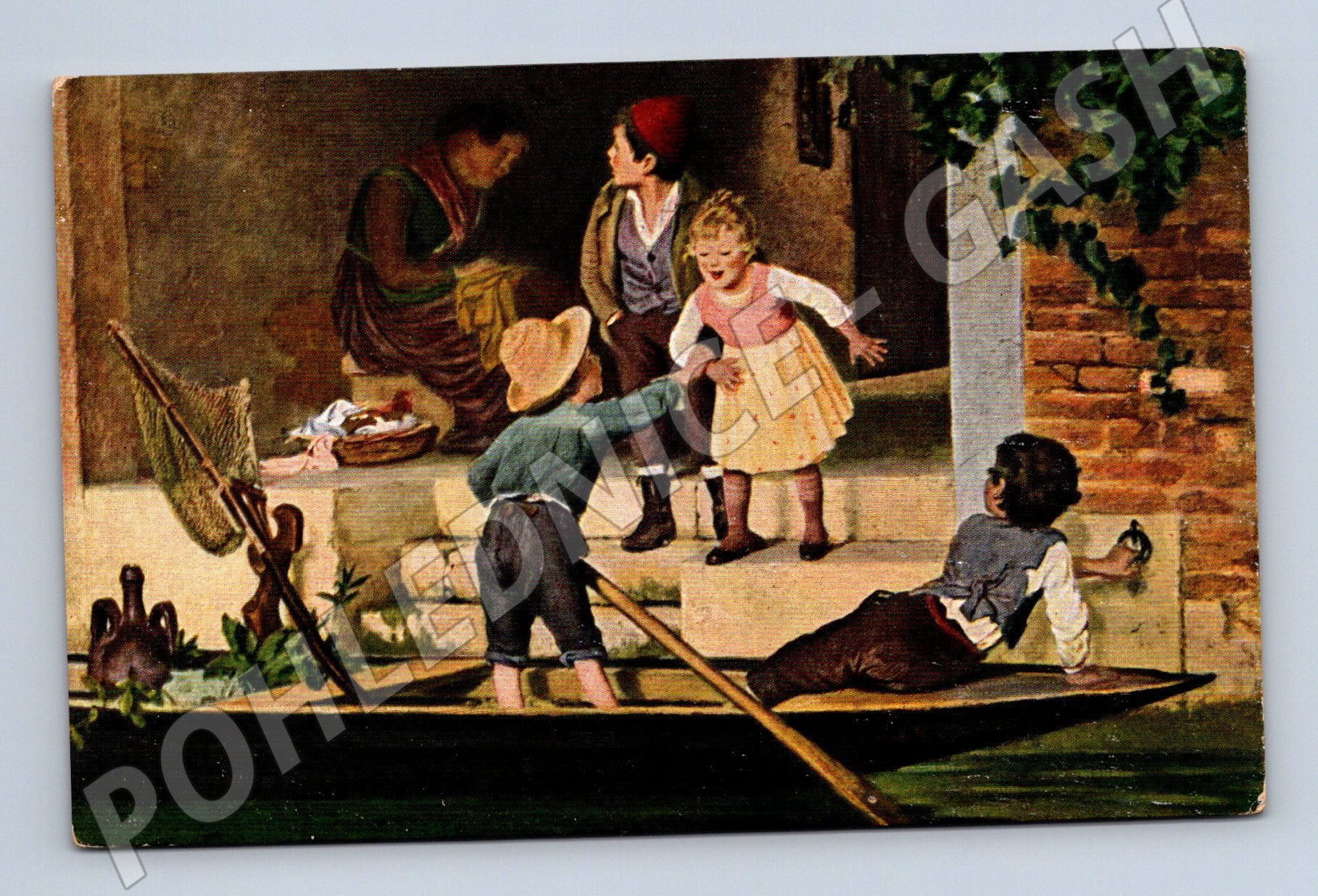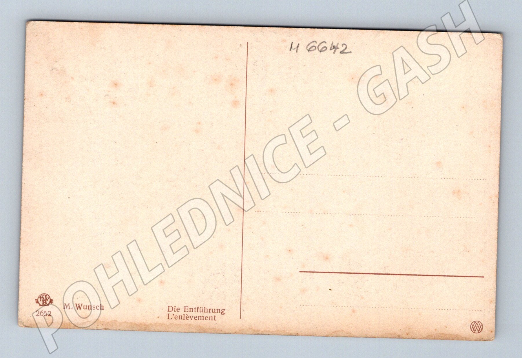 Starší ilustrovaná pohlednice s názvem Die Entführung / L enlèvement od M. Wunsch, č. 2652. Na pohlednici je vyobrazena romantická scéna s dětmi na břehu, kde chlapec ve člunu podává ruku dívce a další děti situaci sledují. V pozadí je vidět starší žena, schody a cihlová zeď porostlá zelení. Pohlednice je ve velmi pěkném stavu, vhodná pro sběratele tematických pohlednic s vodní dopravou a venkovskými motivy. Neprošlá poštou. Rozměry standardní pro historické pohlednice. Na zadní straně výrobní informace a prostor pro adresu.
