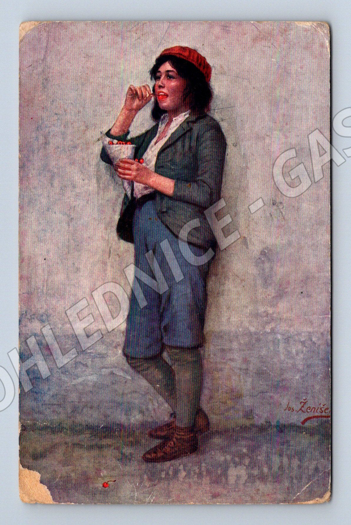 Starší pohlednice z edice Galerie českých mistrů, nese název První třešně od malíře J. Ženíška. Na přední straně je reprodukce obrazu s mladou dívkou v kroji s červenou čepicí, ležící na zemi a pojídající třešně. Barevné provedení, mírně opotřebené rohy a patrné stopy stáří i používání (viz foto). Zadní strana nenapsaná, určeno ke sběratelským účelům. Vhodné pro sběratele pohlednic s malířskými motivy či českého umění.