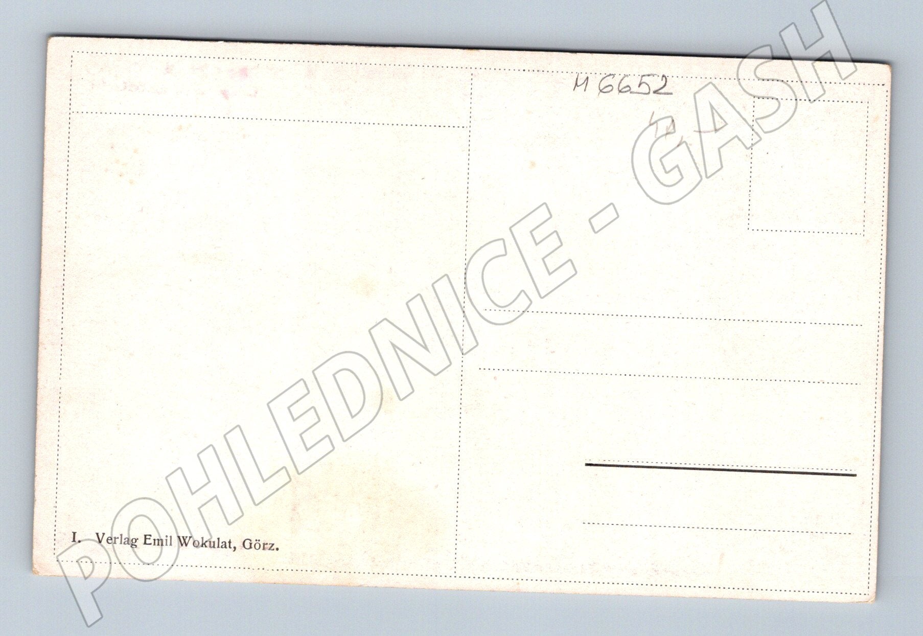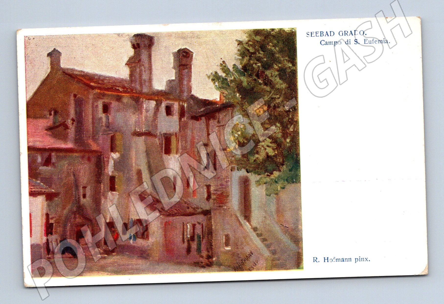 Starší malovaná pohlednice s motivem Seebad Grado (Campo di S. Eufemia), od autora R. Hofmann. Na přední straně je umělecké ztvárnění historického domu s komíny a zelení. Pohlednice nebyla dosud použita, je čistá a ve velmi dobrém sběratelském stavu. Vydavatel: Verlag Emil Wokulat, Görz. Skvělý přírůstek do sbírky malovaných pohlednic z Evropy či Itálie.