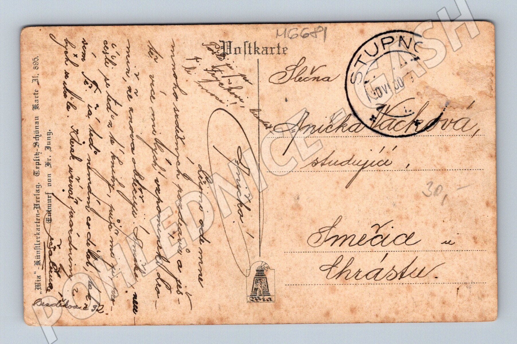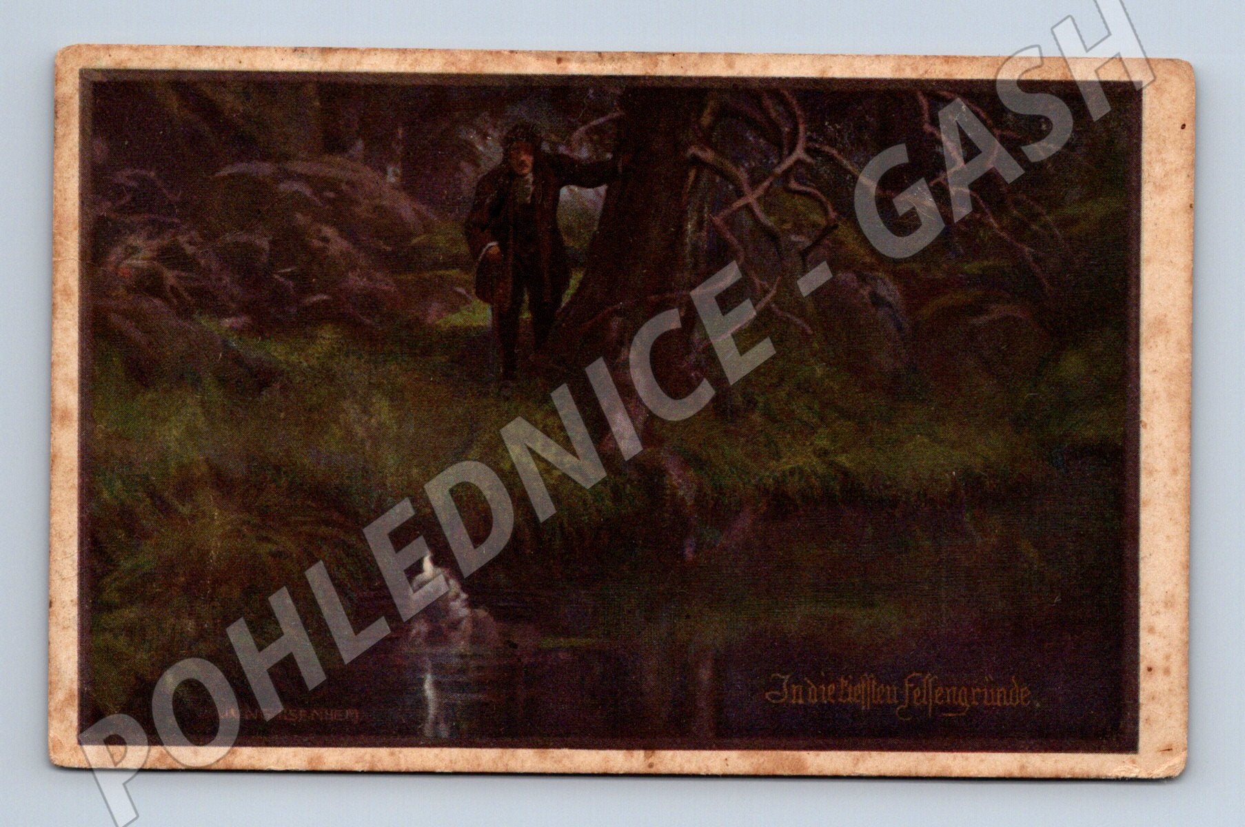 Nabízím sběratelskou pohlednici s motivem malířského díla od známého autora. Pohlednice zachycuje romantickou scénu v lese, kde stojí postava opřená o strom a pozoruje vodní hladinu, v níž se odráží bílá postava – pravděpodobně ztvárnění ducha či nadpřirozené bytosti. Spodní okraj obrazu nese text In die tiefsten Felsengründe . Zadní strana pohlednice je s původní ručně psanou korespondencí, adresována na slečnu Apničku Tačkovou do Smečic u Chraštu. Místní razítko STUPNČ, datováno listopad 1930. Pohlednice nese známky stáří – patina, drobné flíčky a opotřebení, vše odpovídá autenticitě a stáří tohoto historického kusu. Velmi zajímavý kousek pro milovníky malířství a dobové korespondence.