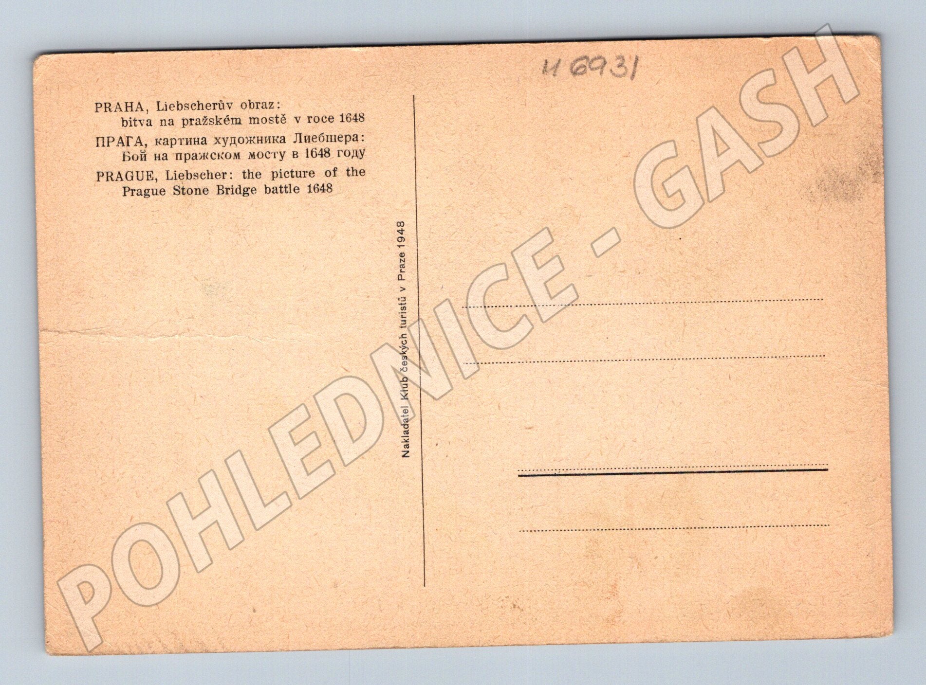 Nabízím originální pohlednici s motivem slavné bitvy na pražském Karlově mostě v roce 1648 podle obrazu malíře Liebschera. Pohlednice zachycuje dramatickou scénu z dějin Prahy s pohledem na Pražský hrad v pozadí. Text na zadní straně ve třech jazycích (čeština, ruština, angličtina). Vydal Klub českých turistů v Praze, 1948. Pohlednice je ve slušném sběratelském stavu, mírné opotřebení odpovídající stáří. Vhodná pro sběratele historických pohlednic a pražských motivů.