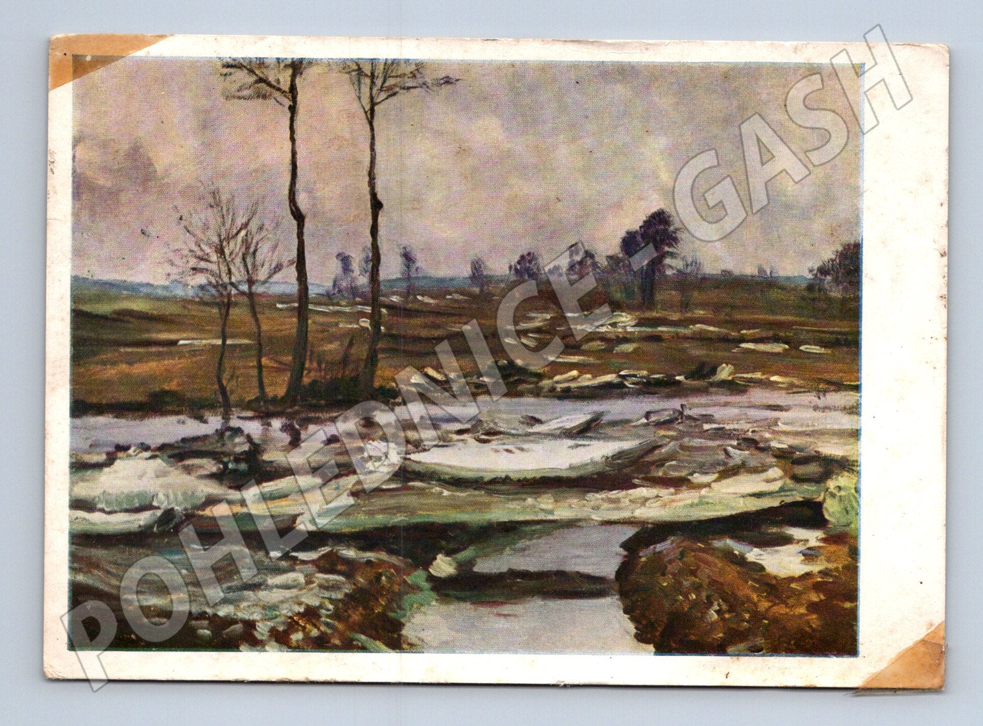 Pohlednice F. Kaván – Odchod ledů na Chrudimce, malířský motiv, použito