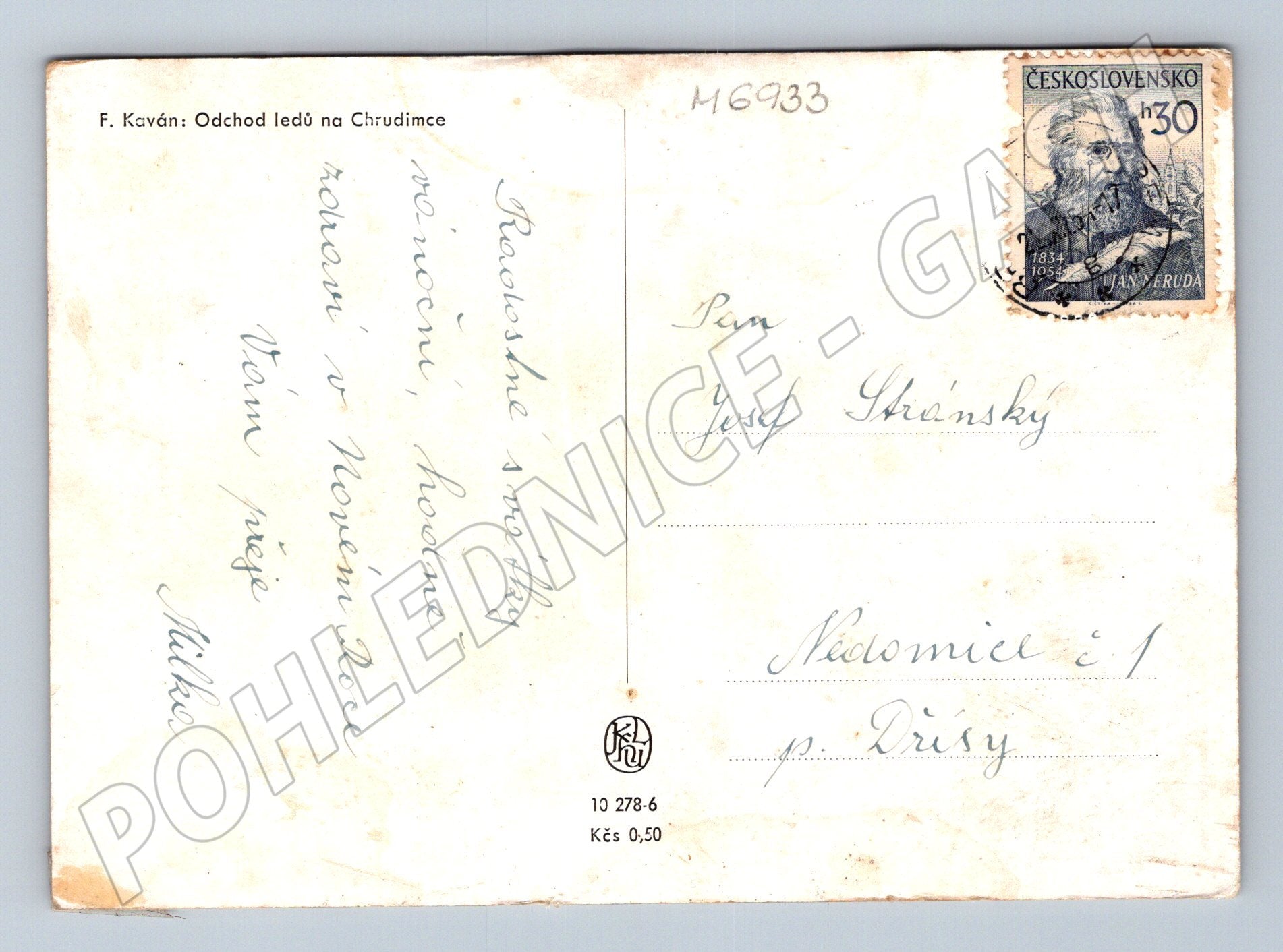 Pohlednice s reprodukcí obrazu od malíře F. Kavána nazvaného Odchod ledů na Chrudimce . Pohlednice nese krásný malířský motiv jarní krajiny s odcházejícím ledem na řece a je opatřena poštovní známkou s portrétem Jana Nerudy o hodnotě 30 h (Československo). Na zadní straně je ručně psané věnování, adresováno do Nedomic. Pohlednice pochází z období Československa, známky používání a stáří znatelné na okrajích (mírné opotřebení, lehce ohnuté rohy). Skvělý sběratelský kus pro milovníky umění a historických pohlednic.