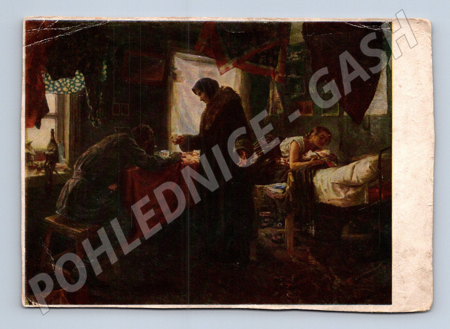 Stará pohlednice s reprodukcí obrazu Před odevzdáním do nalezince od N. A. Kasatkina. Pohlednice je datována a prošla poštou, na zadní straně ručně psaný text a poštovní známka. Přední stranu zdobí malířské zpracování žánrové scény z interiéru s postavou ženy, dítětem a dalšími osobami. Pohlednice vykazuje stopy opotřebení – rohy jsou ohnuté a místy lehce natržené. Jedná se o zajímavý sběratelský kousek z oblasti malířství, vhodný pro milovníky umění i historické korespondence.