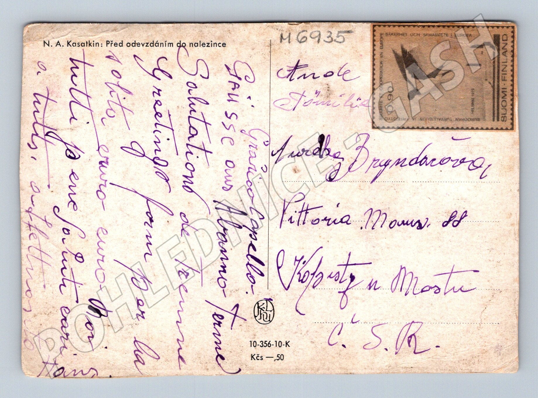 Pohlednice N. A. Kasatkin – Před odevzdáním do nalezince, prošlá poštou