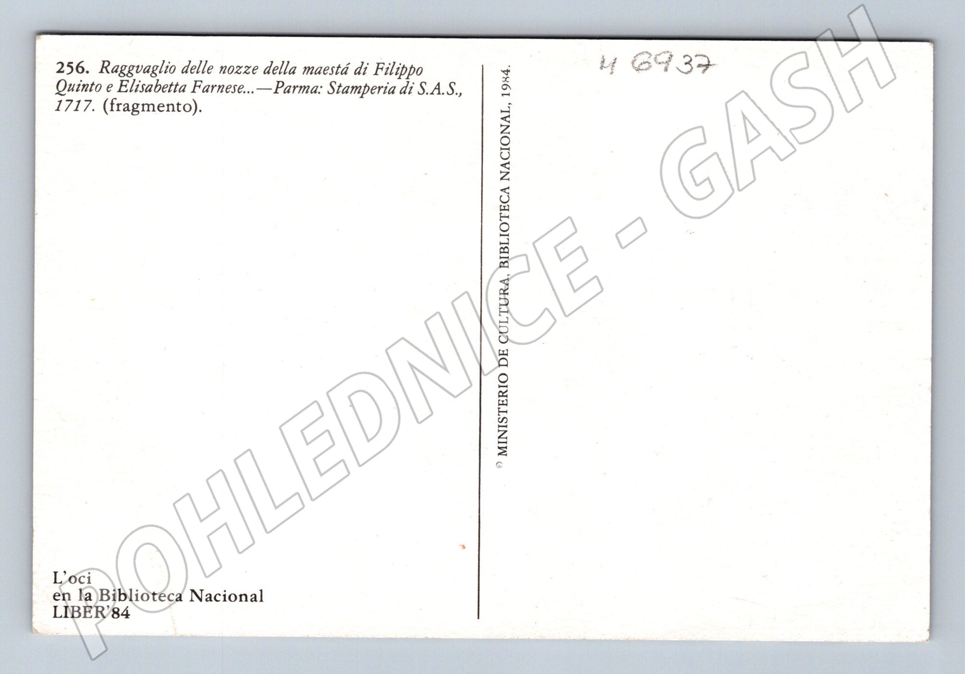 Unikátní pohlednice zachycující historickou slavnostní přehlídku kočárů s koňským spřežením. Na bohatě ilustrovaném motivu jsou vyobrazeny ozdobné kočáry, jezdecký doprovod v dobových uniformách a detaily slavnostní události – svatby Filippa Quinta a Elisabetty Farnese roku 1717, která proběhla v Parmě. Zadní strana pohlednice obsahuje stručný popis ve španělštině a italštině a razítko vydavatele – Biblioteca Nacional, Liber 84. Pohlednice je vhodná pro sběratele historických motivů, dopravy a slavností.