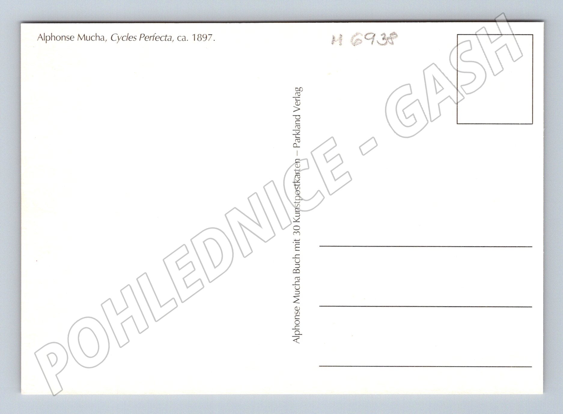 Pohlednice s reprodukcí slavného plakátu Cycles Perfecta od Alfonse Muchy z roku 1897. Pohlednice zachycuje secesní styl charakteristický pro Muchovu tvorbu. Motivem je elegantní žena s květinovou výzdobou ve vlasech a s kolem, což původně sloužilo pro reklamu na kola značky Perfecta. Na zadní straně je text s názvem díla a autorem v němčině i angličtině. Pohlednice je neprošlá a ve velmi dobrém stavu, vhodná pro sběratele i milovníky secesního umění.