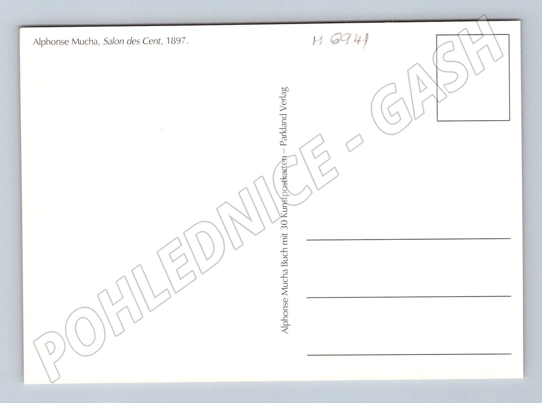 Nabízím pohlednici s motivem slavného plakátu Salon des Cent (1897) od Alfonse Muchy, jednoho z nejvýznamnějších představitelů secese. Pohlednice je reprodukcí originálního díla, které bylo vytvořeno pro pařížskou výstavu v Salon des Cent. Na přední straně je zachycena typická stylizovaná žena obklopená květinami a ornamenty ve žluto-oranžových tónech. Rub pohlednice je neprošlý, s informací o autorovi a vydavateli (Parkland Verlag). Skvělý sběratelský kousek pro milovníky umění a secese.