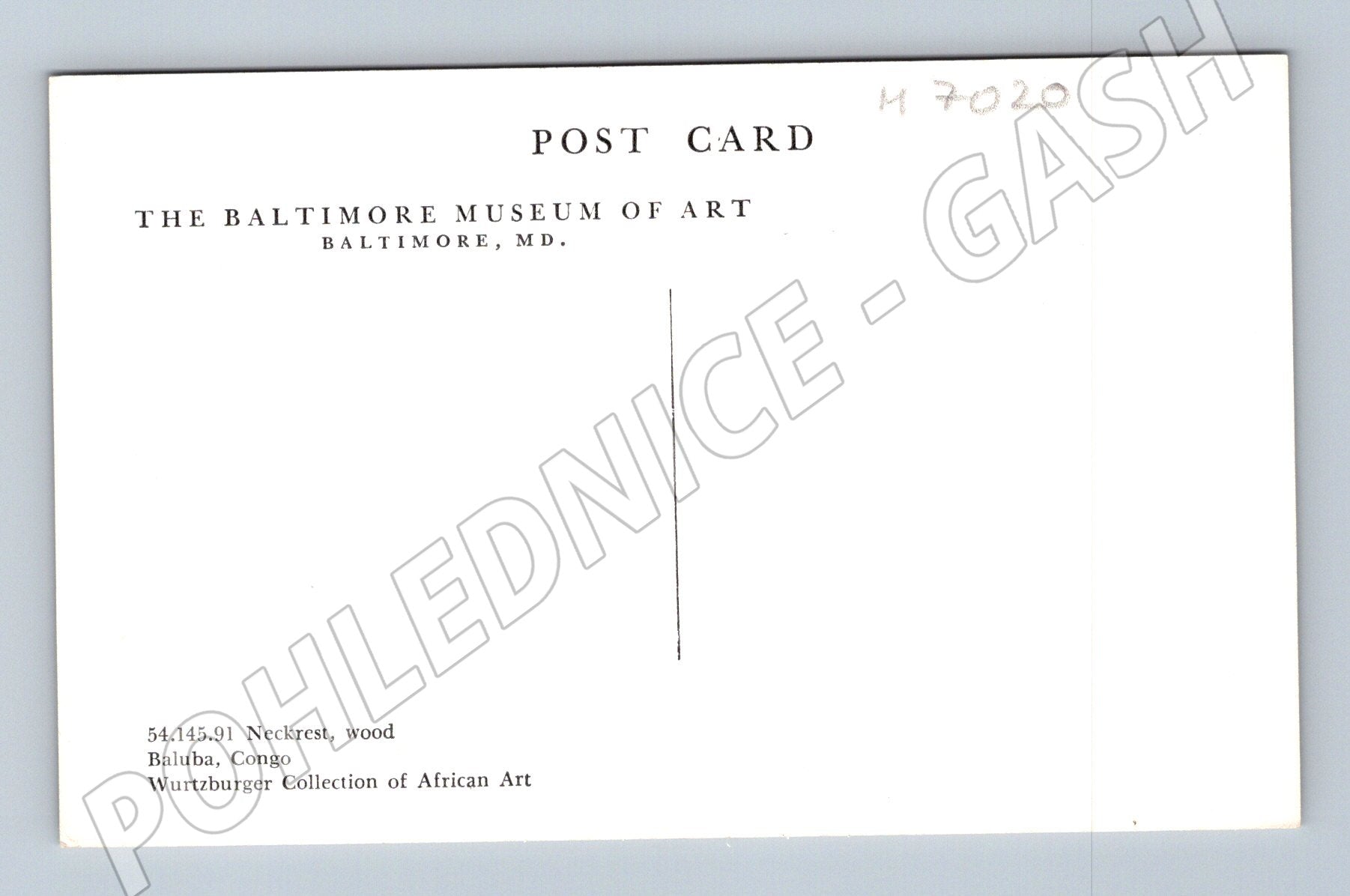 Nabízím originální pohlednici z muzejní sbírky The Baltimore Museum of Art (Baltimore, MD, USA). Pohlednice zobrazuje detailní černobílou fotografii dřevěného podhlavníku (neckrest) z africké etnické skupiny Baluba (Kongo). Tato pohlednice pochází ze sbírky Wurtzburger Collection of African Art. Text vzadu: 54.145.91 Neckrest, wood. Baluba, Congo. Wurtzburger Collection of African Art. Stav pohlednice velmi dobrý – bez psaní, čistá, bez poškození. Skvělý kousek pro sběratele afrického umění či etnografie.