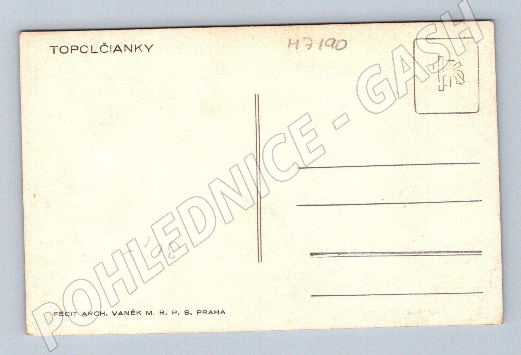 Originální černobílá pohlednice se zámkem Topoľčianky. Na přední straně je zobrazen zámek mezi stromy, pohlednice nese znaky stáří (pravděpodobně předválečné období, malý formát). Na zadní straně je uveden název místa TOPOLČIANKY, autor Arch. Vaněk (Praha) i typické rozdělení pro poštovní použití. Výborný sběratelský kousek pro milovníky historických pohlednic zámků ze Slovenska či Československa. Stav viz sken, místy drobné známky opotřebení, bez zápisu.