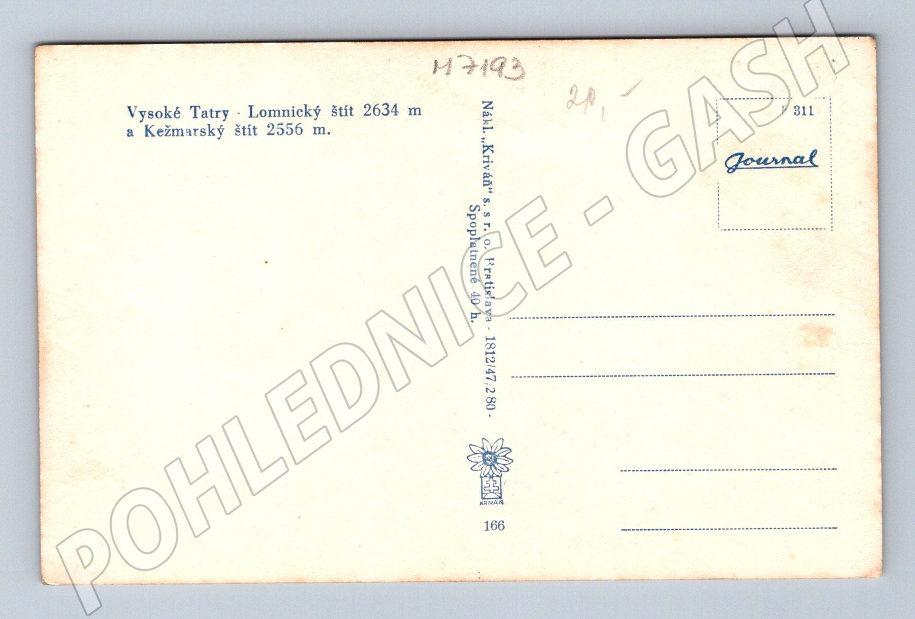 Originální stará pohlednice zachycující Lomnický štít (2634 m) a Kežmarský štít (2556 m) ve Vysokých Tatrách. Jedná se o černobílou pohlednici malého formátu, vydanou pravděpodobně před rokem 1950. Na zadní straně je vytištěn popis, vydavatel: Křiváň, Bratislava. Pohlednice je v pěkném sběratelském stavu s jemnými stopami stáří. Ideální přírůstek do sbírky historických pohlednic Slovenska či Tater.