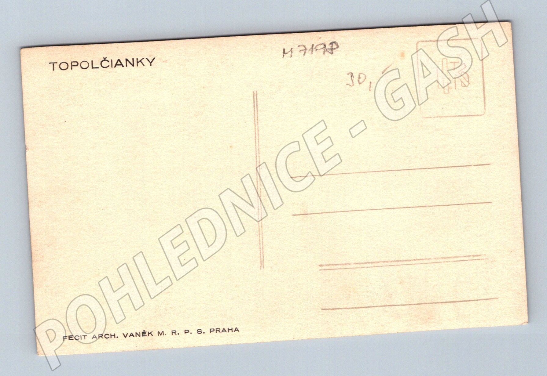 Originální stará pohlednice s motivem z Topoľčianek na Slovensku. Na přední straně je zachycena historická architektura, pravděpodobně část místního zámku nebo významné budovy s typickými arkádami a věžemi. Pohlednice ve velmi dobrém sběratelském stavu, bez popisu či zaslání poštou. Zadní strana nese označení autora Fecit Arch. Vaněk M. R. P. S. Praha a je určena pro klasické poštovní využití. Vhodné do sbírky, pro milovníky historických pohlednic a slovenské architektury.