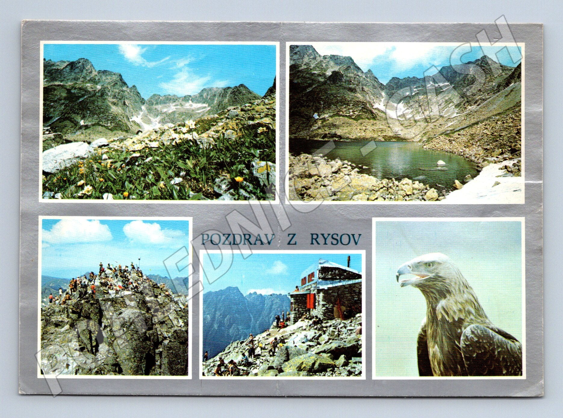 Originální pohlednice s motivem Vysokých Tater a vrcholu Rysy. Na přední straně je více fotografií zachycujících horskou krajinu, turistickou chatu, skupiny turistů a majestátního orla skalního. Text Pozdrav z Rysov upozorňuje na slavný turistický cíl. Pohlednice je použita, s původním rukopisným textem a adresou. Vydavatelství Pravda Bratislava, foto Juraj Mülle, Štefan Hamza. Ideální pro sběratele regionálních pohlednic a milovníky slovenských hor.