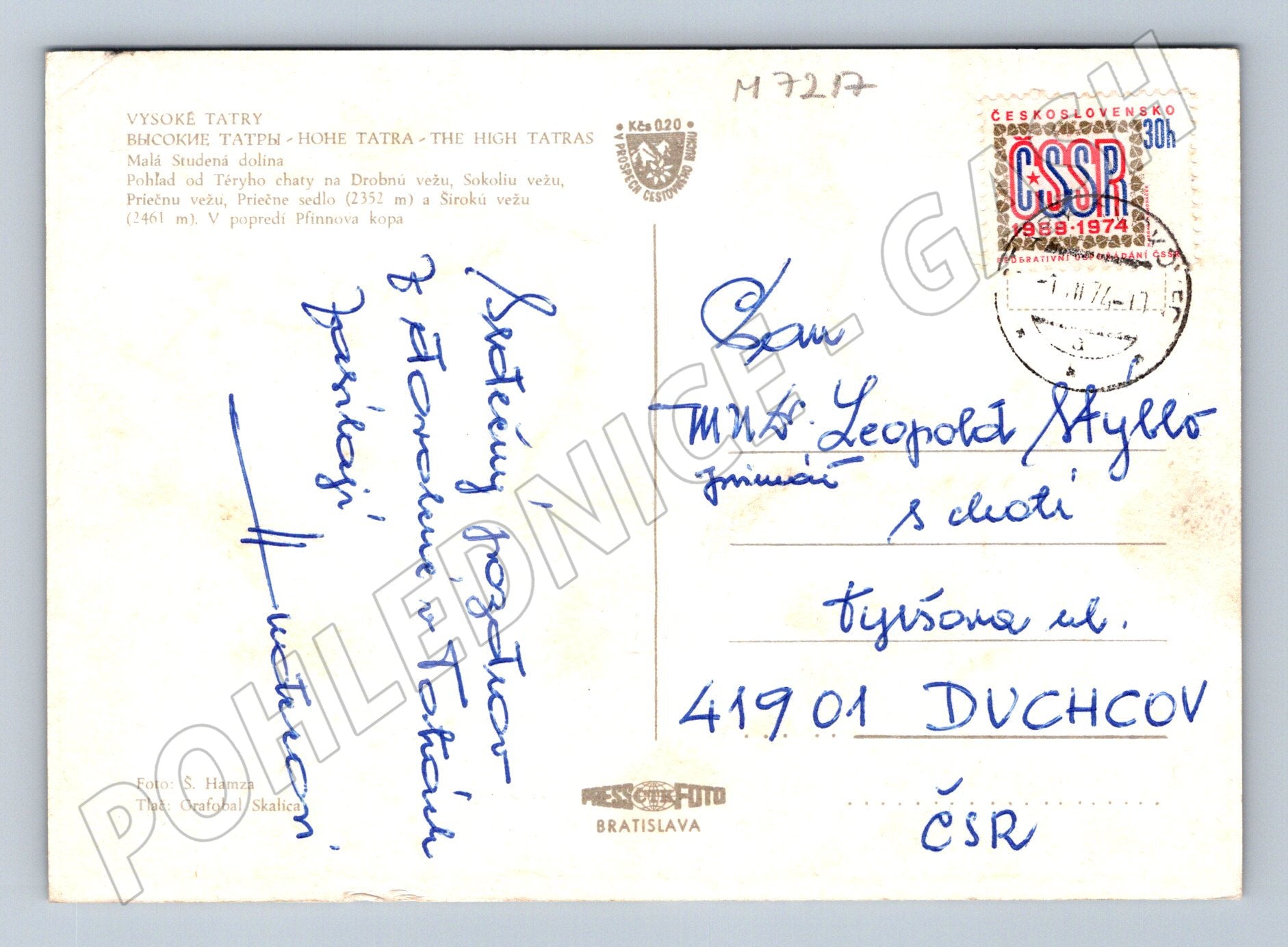 Originální pohlednice Vysoké Tatry s motivem horské krajiny v Malé Studené dolině. Na přední straně je barevná fotografie impozantních štítů a skalnatého terénu, v popředí horská květena a logo Vysoké Tatry. Zadní strana je vyplněná, s ručně psaným vzkazem, adresou a známkou ČSSR z roku 1974. Pohlednice nese známky oběhu a její stav odpovídá stáří. Jedná se o pěkný sběratelský kousek s autentickou atmosférou tehdejší doby. Formát cca 10 x 15 cm. Vydal: Grafobal Skalica, foto S. Hamza.