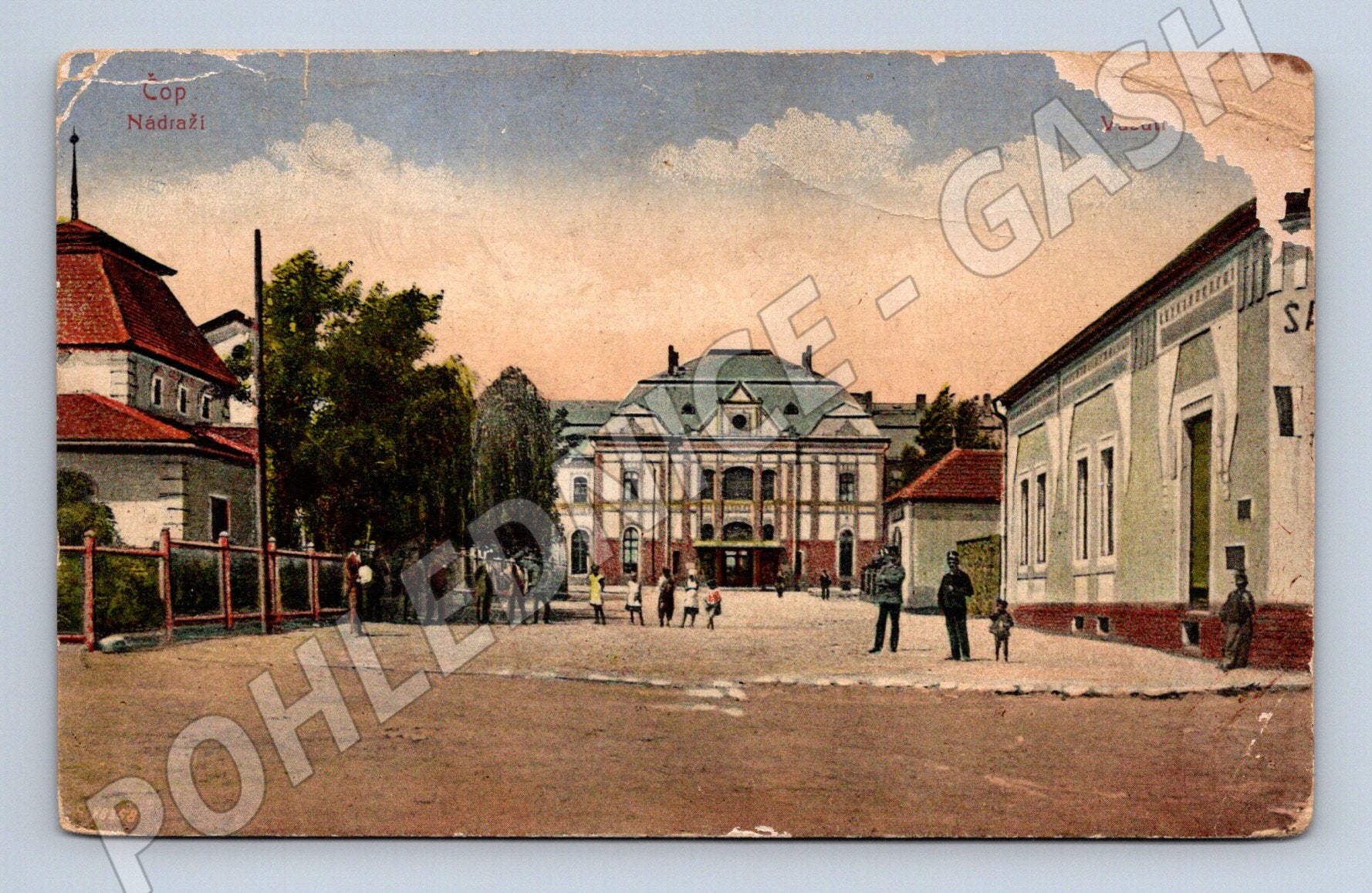 Originální historická pohlednice s vyobrazením nádraží v obci Čop (dnešní Ukrajina/Zakarpatí). Pohlednice je kolorovaná, zachycuje budovu nádraží a jeho okolí s několika postavami. Na rubové straně je původní ručně psaný text a adresace, která vypovídá o skutečném použití. Stav odpovídá stáří pohlednice – rohy a okraje jsou lehce opotřebované, na líci i rubu jsou stopy stáří. Výjimečný historický sběratelský kousek vhodný do kolekce tematizované na železniční dopravu nebo regionální historii. Formát klasický malý, odhad stáří před rokem 1950.