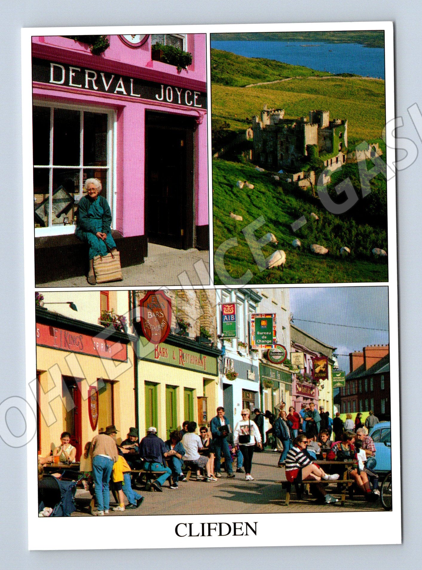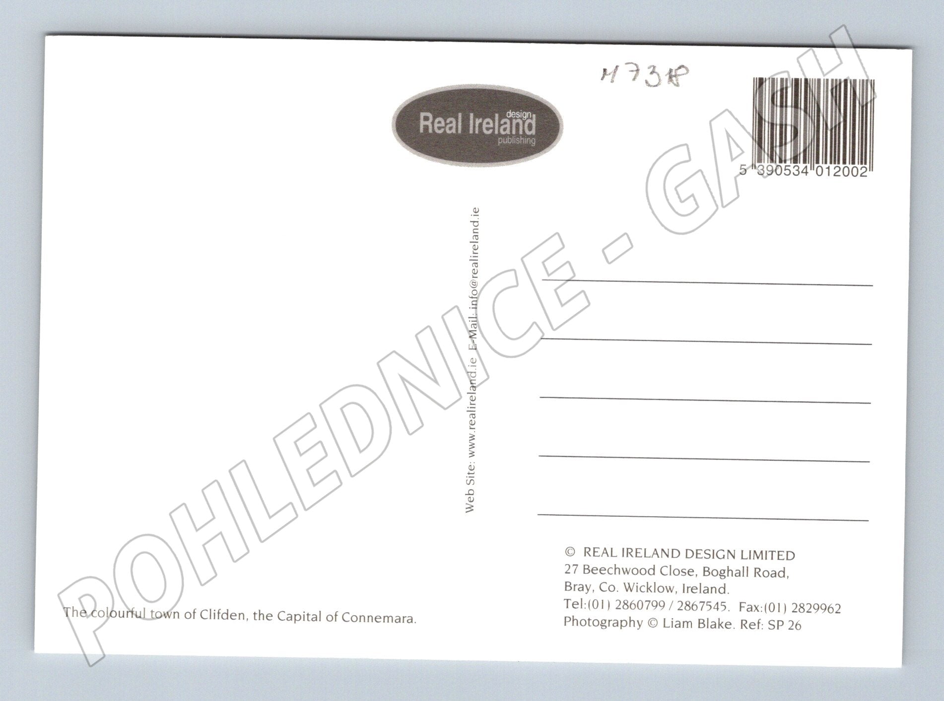 Originální pohlednice z irského města Clifden, centra oblasti Connemara. Na přední straně jsou vyobrazeny typicky barevné ulice města plné života, tradiční hospody a malebné prostředí s hradem a zelenými pastvinami. Pohlednice je vydána společností Real Ireland Design Limited. Zezadu je zachována prostorem pro napsání adresy a textu. Velmi pěkný stav, skvělý sběratelský kousek nebo krásný suvenýr z Irska!