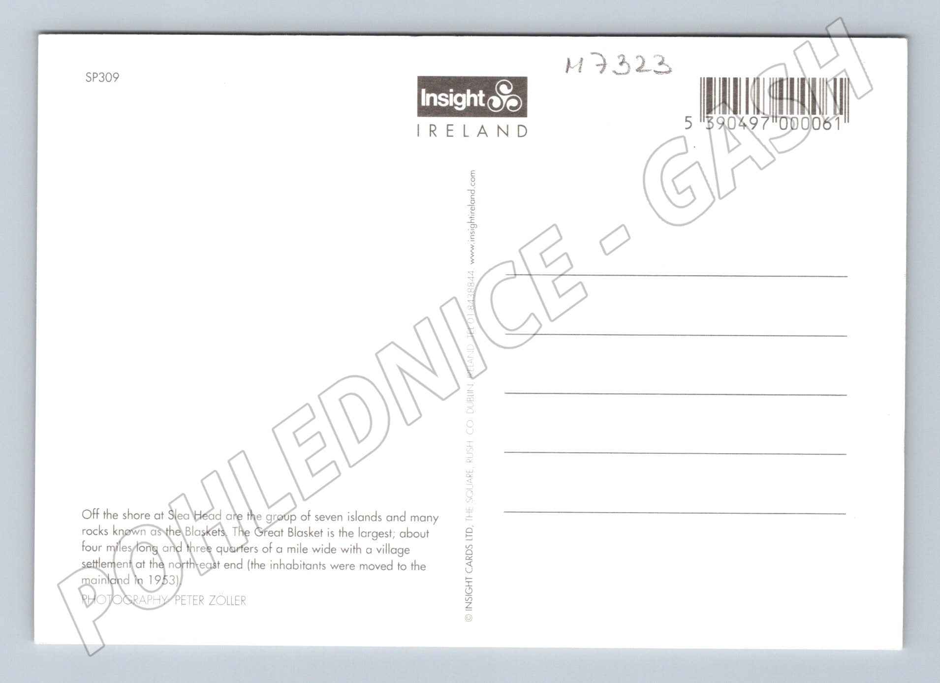 Pohlednice s panoramatem poloostrova Dingle v Irsku a skupiny ostrůvků Blaskets. Na přední straně je barevná fotografie zelené irské krajiny s roztroušenými farmami a Atlantikem v pozadí. Na zadní straně je anglický popis: Skupina sedmi ostrovů a skal u pobřeží Slea Head je známa jako Blaskets. Největším je ostrov Great Blasket, přibližně 6,4 km dlouhý a 1,2 km široký, s vesnickým osídlením na severovýchodním cípu (obyvatelé byli přesídleni v roce 1953). Autor fotografie Peter Zöller. Pohlednice nebyla použitá, ve výborném stavu, sběratelský kousek z Irska.