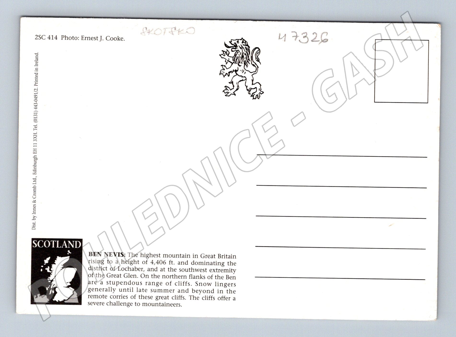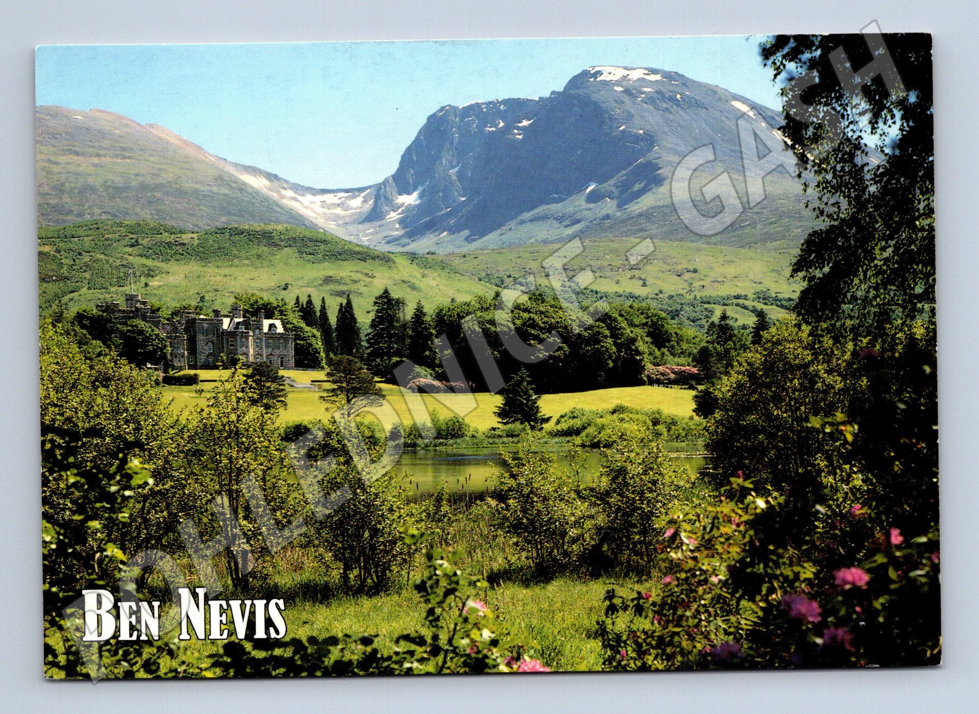 Originální pohlednice s motivem nejvyšší hory Velké Británie – Ben Nevis (1343 m.n.m.), která se majestátně tyčí nad malebnou skotskou krajinou a historickým zámkem v popředí. Barevná pohlednice zachycuje letní atmosféru se zelenými kopci, lesy a jezerem pod horou. Na zadní straně je podrobný popis v angličtině, informace o autorovi fotografie (Ernest J. Cooke), místo vydání (Skotsko) a typický skotský motiv. Pohlednice je neprošlá poštou, bez známky i textu. Vhodné pro sběratele pohlednic či milovníky Skotska a Velké Británie.