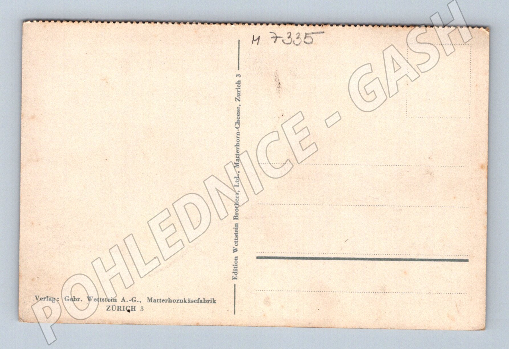 Originální stará pohlednice s barevným vyobrazením slavného vrcholu Matterhorn (4505 m) ve švýcarských Alpách. V popředí malebné horské chaty obklopené travnatou loukou a květinami, v pozadí majestátní hora Matterhorn. Fotograf: J. Gabarell. Na zadní straně je pohlednice standardně nepopsaná, vydavatel Gebr. Wettstein A.-G., Matterhornkäsfabrik, Zürich 3. Výborný sběratelský stav s drobnými známkami stáří (viz foto). Skvělý přírůstek do sbírky pohlednic s tématikou Švýcarska a Alp.