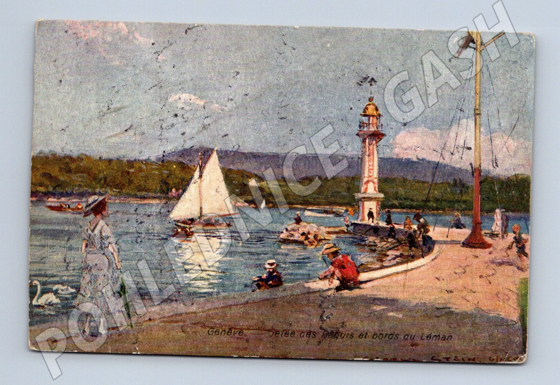 Historická pohlednice zobrazující nábřeží, maják a plachetnici na Ženevském jezeře (Lac Léman) ve Švýcarsku. Na pohlednici je vyobrazena poklidná atmosféra u vody, v popředí stojí žena v dobových šatech a na břehu lze spatřit několik osob, včetně dětí a rybářů. Na levé straně pluje bílá loďka a na hladině jsou labutě. Barevné provedení pohlednice je zachováno v jemných pastelových odstínech, typických pro počátek 20. století. Zadní strana je popsána ručně psaným textem a určena pro adresu do Haslau. Vydavatel: Roger Diserens, Edit. Genève. Pohlednice vykazuje drobné známky stáří, což přidává na jejím kouzlu a sběratelské hodnotě. Krásný kousek do sbírky pohlednic ze Švýcarska nebo motivů jezer a městských nábřeží.