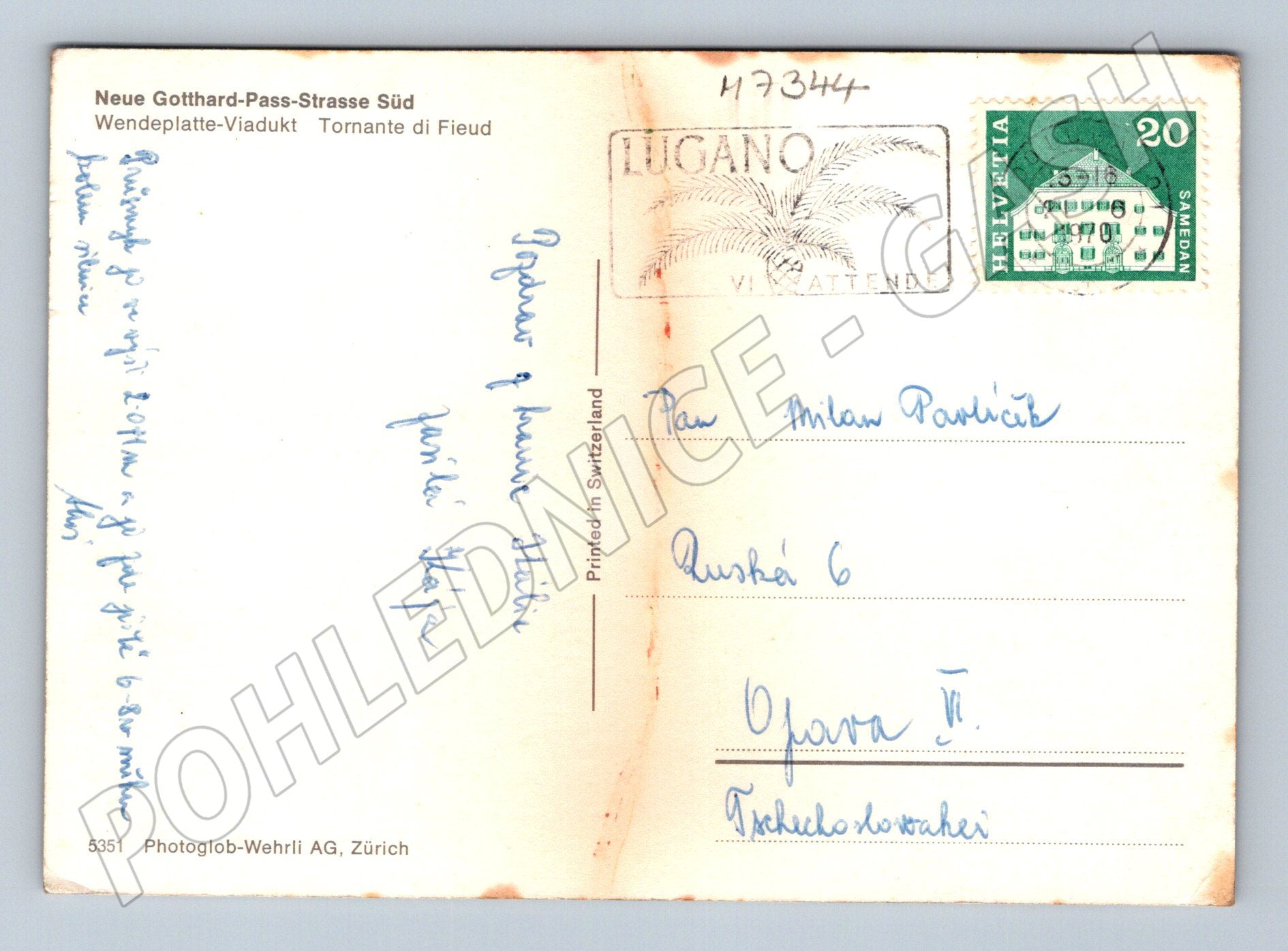 Pohlednice zobrazuje monumentální viadukt na jižní větvi švýcarské Gotthardské silnice (Neue Gotthard-Pass-Strasse Süd), konkrétně úsek Wendeplatte-Viadukt, Tornante di Fleud“ na pozadí alpské krajiny s vysokými zasněženými vrcholy. Na zadní straně pohlednice je švýcarská známka a razítko z Lugana, nechybí ani ručně psaná zpráva. Vydavatel: Photoglob-Wehrli AG, Zürich. Pohlednice je odeslaná, se stopami běžného používání a stáří.