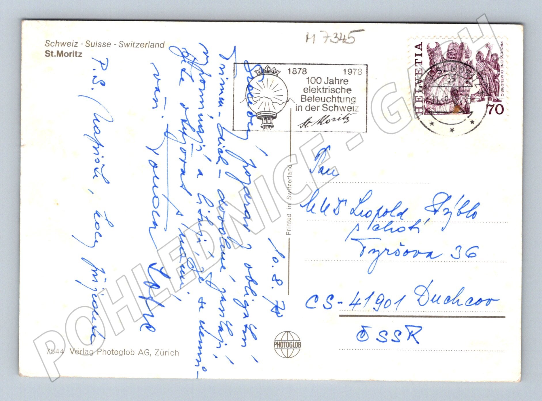 Originální pohlednice ze švýcarského města St. Moritz, známého střediska zimních sportů a luxusní turistiky. Na přední straně pohlednice je koláž fotografií zobrazujících ikonická místa a malebné scenérie St. Moritz, včetně historických budov, kostela a krásné horské krajiny. Součástí je také tradičně oděná postava, což podtrhuje švýcarský folklór. Zadní strana je s ručně psaným textem, originální švýcarské razítko a známka (70 Helvetia). Rok odeslání 1978 – zajímavost pro sběratele. Pohlednice je v dobrém stavu, vhodná do sbírky nebo jako stylový dárek.