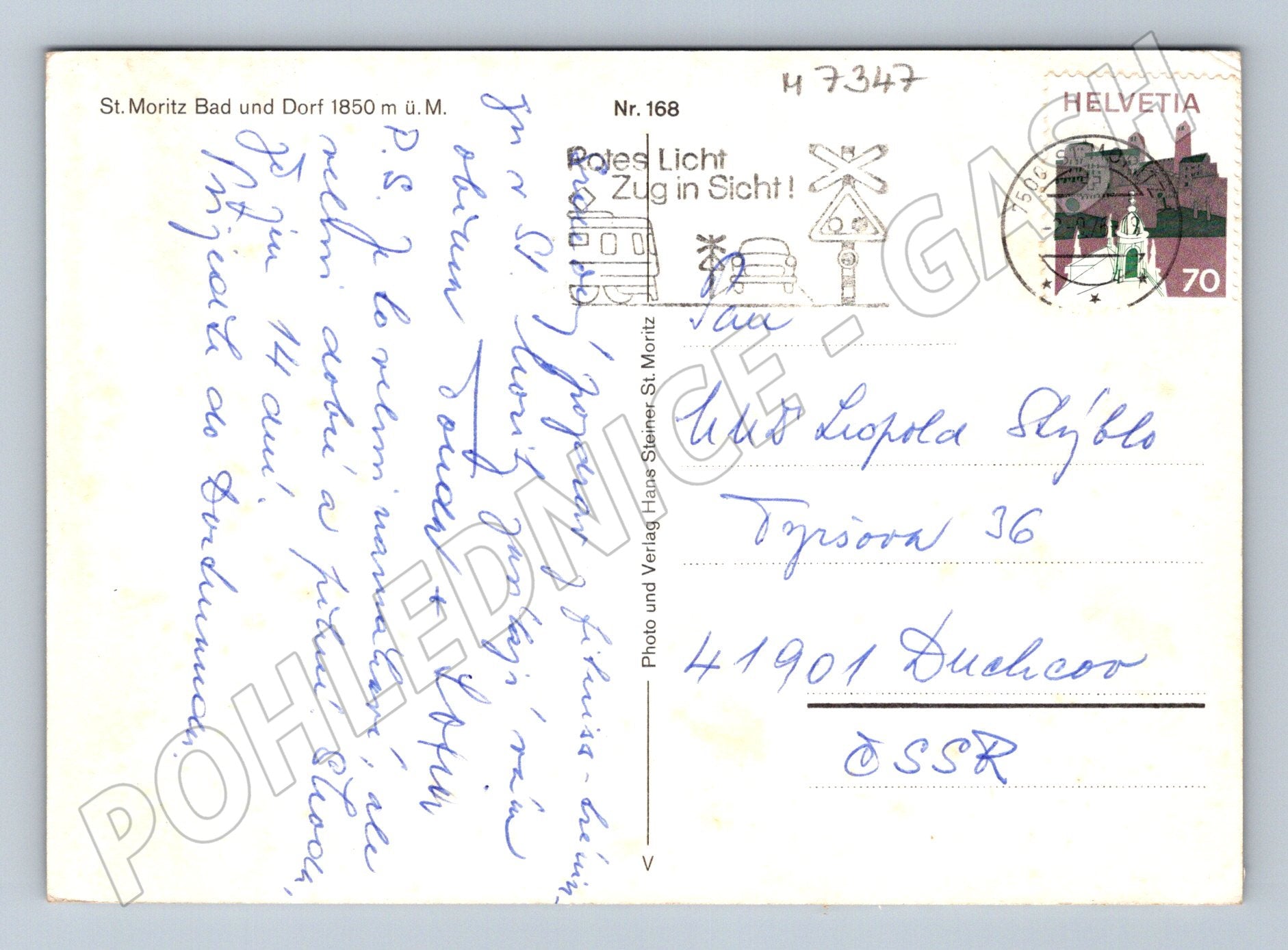 Originální pohlednice s motivem švýcarského střediska St. Moritz. Pohlednice zachycuje panoramatický výhled na město, jezero a zasněžené vrcholky Alp. Jedná se o barevnou pohlednici, která byla skutečně odeslána – na zadní straně naleznete ručně psaný text, známku Helvetia a poštovní razítko. Pohlednice je dobrém sběratelském stavu, bez větších poškození, mírné opotřebení rohů odpovídá stáří. Ideální přírůstek do sbírky zahraničních pohlednic nebo jako dárek milovníkům Alp a Švýcarska.
