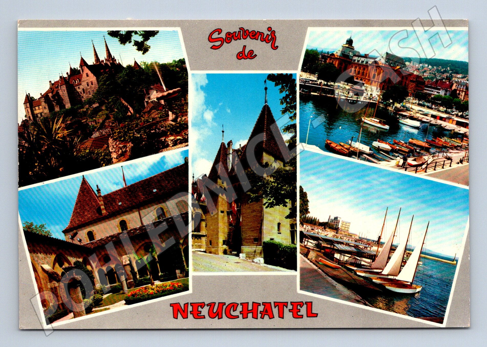 Originální pohlednice s názvem Souvenir de Neuchatel zachycuje několik ikonických pohledů na švýcarské město Neuchâtel. Na přední straně naleznete koláž fotografií, mezi nimiž je historický zámek, malebný přístav s plachetnicemi, dominantní kostel a další významné památky města a okolí. Pohlednice byla odeslána, jak dokládá poštovní známka se švýcarským zámkem a razítko s datem. Zadní strana obsahuje krátké textové věnování a adresu příjemce. Velmi pěkný sběratelský kousek pro milovníky Švýcarska či tematiky evropských měst.