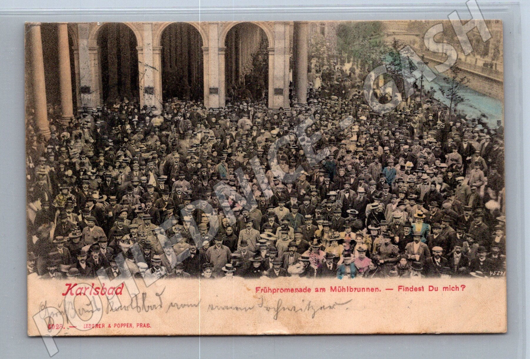Original historical postcard from the Austro-Hungarian period, sent in 1912 from Karlovy Vary (Karlsbad). The postcard depicts the famous promenade in front of the Mill Colonnade (Führpromenade am Mühlbrunnen), typical of the early 20th century. The color lithograph with a large number of figures in period clothing offers an interesting glimpse into the atmosphere of the spa town of that time. On the front side, the inscription Karlsbad and text in German, the postcard was published by Ledermann & Popper, Prague. The back side with original postmarks, stamp and handwritten text. Very nice collector's condition, suitable for thematic collections focused on spas, architecture and history of the Czech Republic.